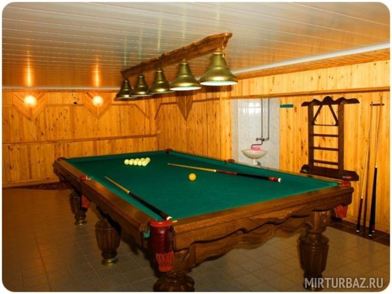 Спортивный коттедж обустроен для проживания двух семей и одной компании: в нем расположены два небольших, уютных гостиничных номера, и двухкомнатный номер с отдельным входом в котором есть просторный холл для отдыха и приема пищи, кухня, оборудованная всем необходимым, для самостоятельного приготовления. Во всех номерах санузлы с душевыми кабинами, горячая и холодная вода круглосуточно. В цокольном этаже здания отлично оснащенная билльярдная и сауна, с бассейном и комнатой отдыха.