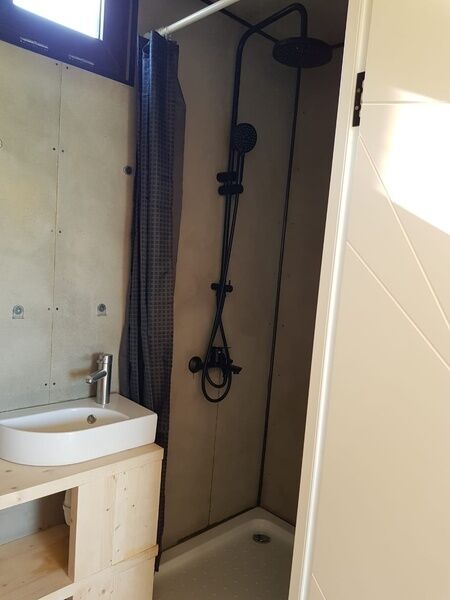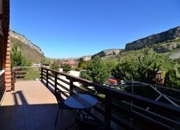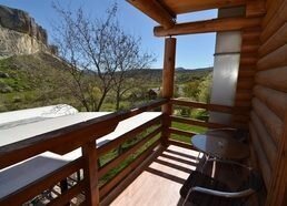 Описание номера: Мини-дом имеет отдельное расположение на территории загородного комплекса «Алимова балка». Из террасы и панорамного окна спальни мини-дома открывается завораживающий вид на горы Качи-Кальон и долину. Мини-дом состоит из спальни, кухонной зоны, ванной комнаты, террасы. В спальне: двуспальная кровать, ТВ, интернет, выдвижная детская кровать, кухонная зона с бытовой техникой (холодильник, микроволновая печь, индукционная плита, чайник, посуда, раковина), кухонный стол и стулья, кондиционер, большой вместительный шкаф. В ванной комнате: душевая зона, туалет, раковина, фен. Открытая терраса со столом и стульями, мангалом