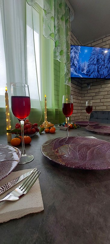 Кухня-гостиная: варочная поверхность, микроволновка, чайник, холодильник, вся посуда, столовые приборы, кофе/чай, соль/сахар/специи. Даже если у Вас позднее заселение и Вы не успели заскочить в магазин, мы не оставим Вас голодными — в холодильнике будут ждать пельмени.
