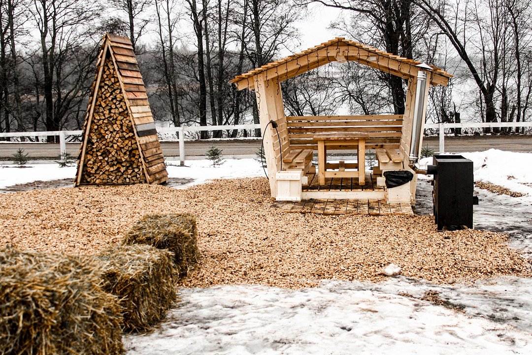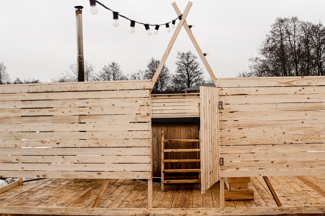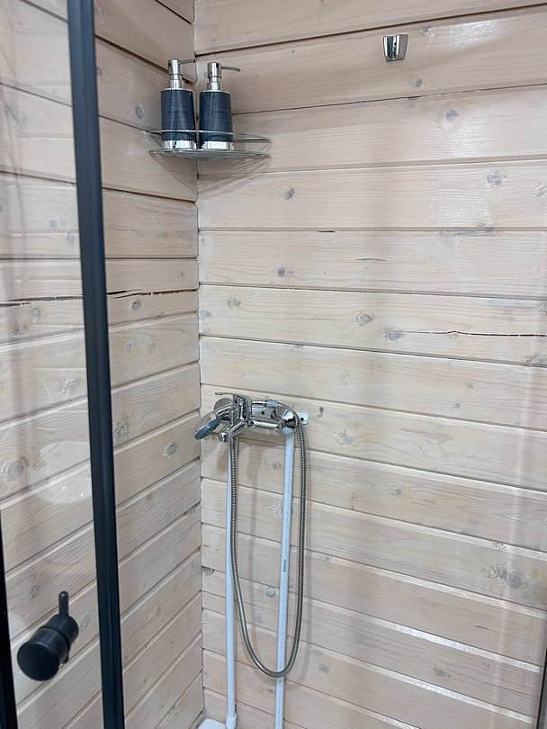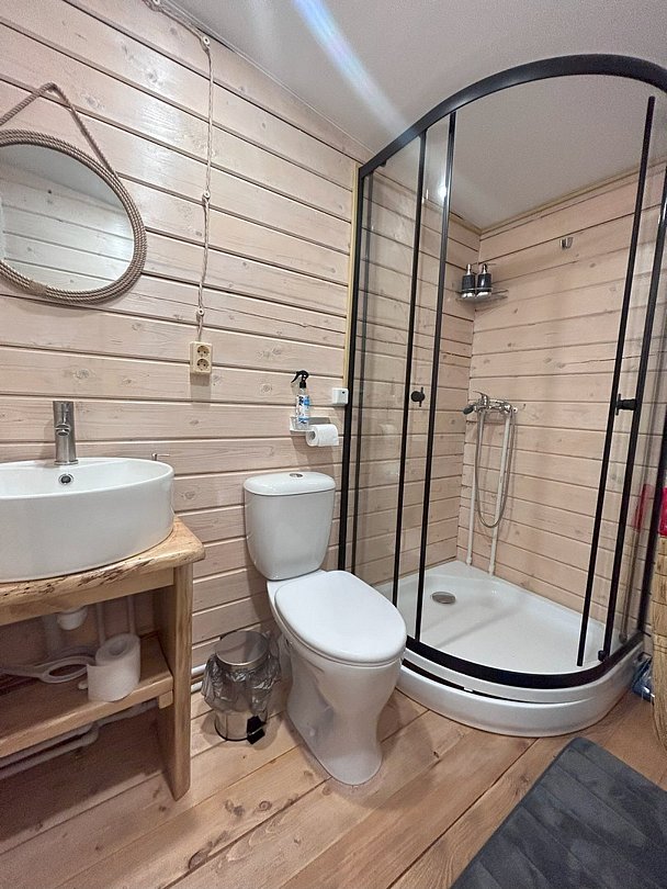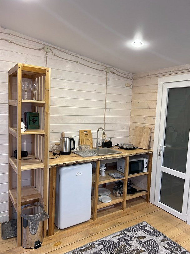 Wi-Fi, кондиционер, микроволновая печь, душевая кабина, тапочки, терраса, кровать «Queen size», вешалки, обеденный стол, зеркало, ковер, унитаз, раковина, отопление, кухонная утварь, стул, стол, туалетные средства, туалет, мангал, диван-кровать, мини-кухня, мылоВ номере