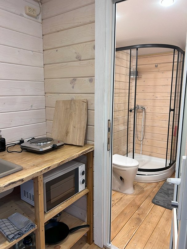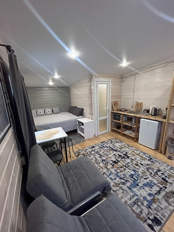 Wi-Fi, кондиционер, микроволновая печь, душевая кабина, тапочки, вешалки, обеденный стол, зеркало, ковер, чайник, унитаз, раковина, отопление, кухонная посуда, кухонная утварь, столовые приборы, стул, туалетные средства, туалет, раскладной диван, мини-холодильник, мини-кухняВ номере