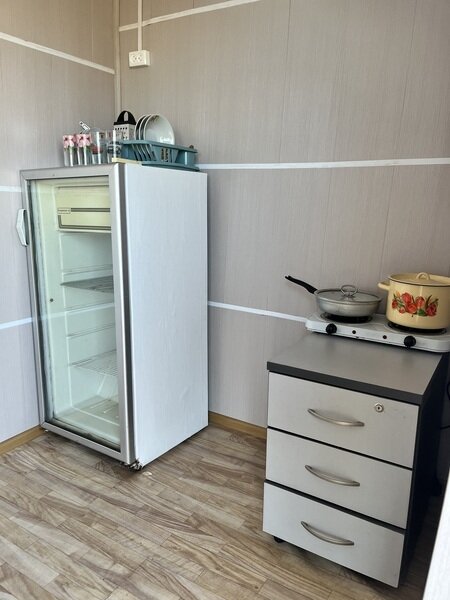 В кухне: раскладной диван, необходимая посуда, чайник, холодильник, плита, микроволновка.
