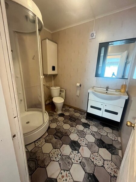 Дом №8, кухня с диваном, комната с двуспальной кроватью. Туалет с раковиной