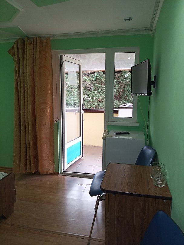 Уютный номер мансардного типа. В номере — ТВ, холодильник, шкаф, жур. столик, два стула, кондиционер санузел, душевая кабина, балкон совмещен на два номера.