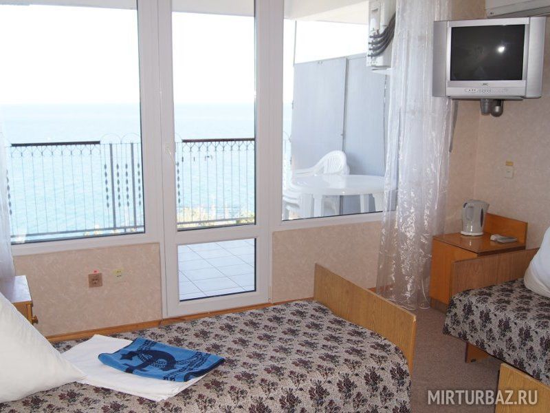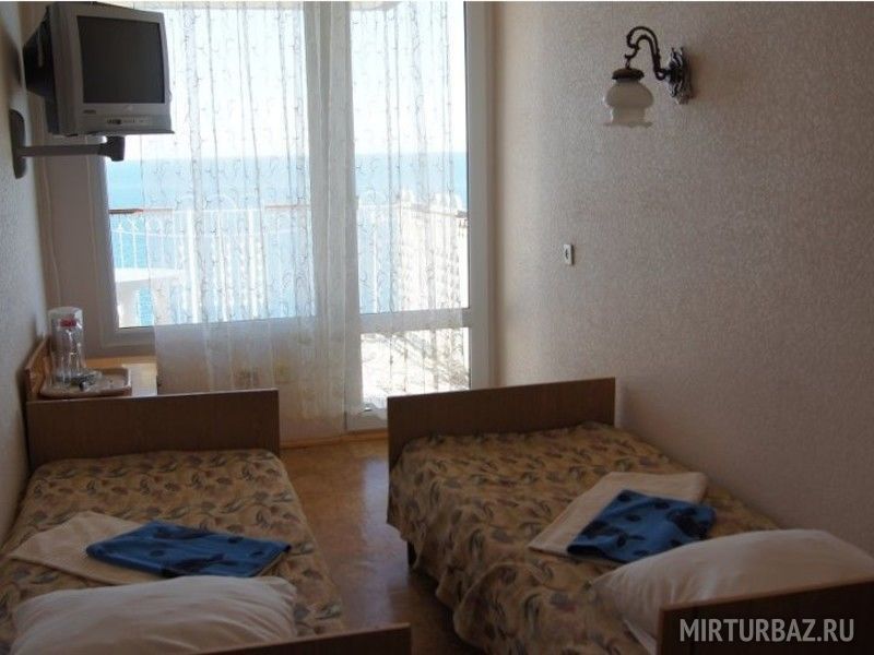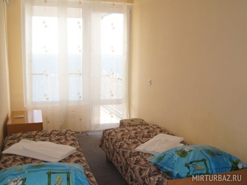 1-комнатный стандарт с выходом на балкон с видом на море (2 основных места). В номере спальная комната с раздельными кроватями и ТВ. Душевая, санузел и холодильник общий на 2 номера.
