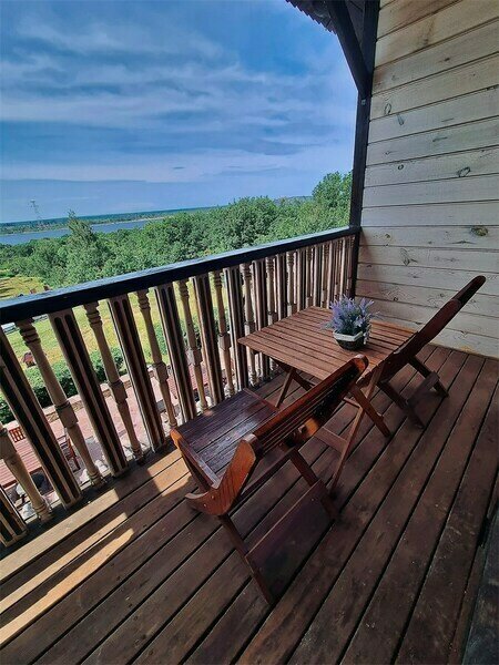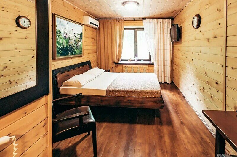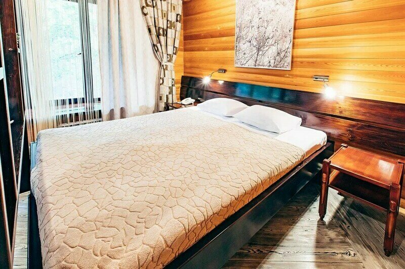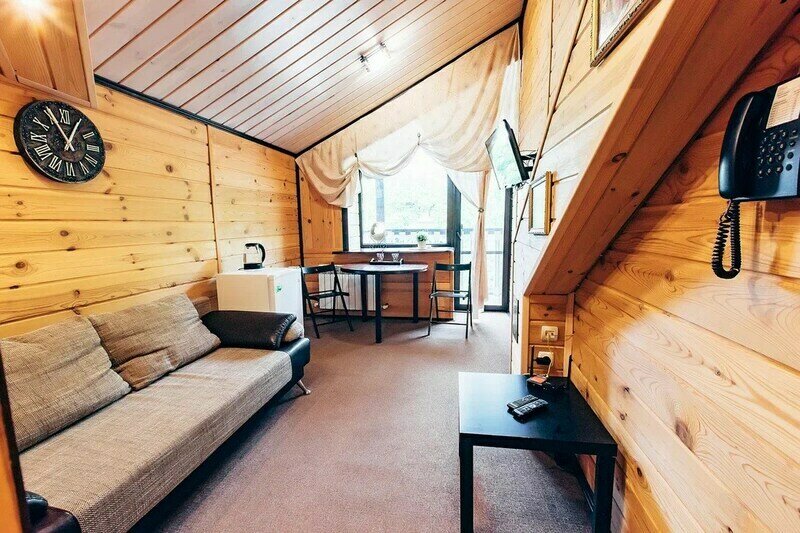 Номер имеет помимо спального места дополнительную площадь для отдыха/работы. Туалет и душ раздельные. Имеются фен, телевизор, холодильник с мини-баром, кондиционер, электрический чайник, Wi-Fi. Окна и балкон с видом на реку Волгу и дубовый лес. Возможна организация дополнительных спальных мест на диване
