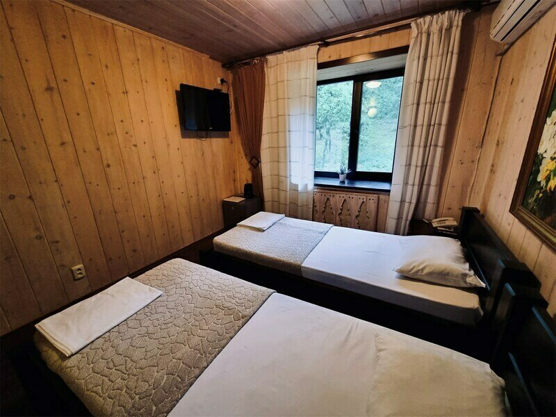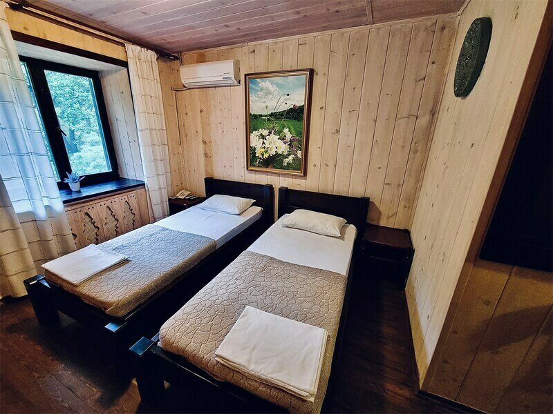 Номер с двумя односпальными кроватями или одной двуспальной. Туалет и душ совмещены (один в блоке из двух номеров). Имеются кондиционер, фен, телевизор, холодильник с мини-баром, Wi-Fi.