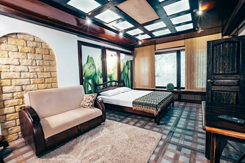 Номер имеет помимо спального места дополнительную площадь для отдыха/работы. Туалет и душ совмещены. Имеются кондиционер, фен, телевизор, холодильник с мини-баром, Wi-Fi. Возможна организация дополнительных спальных мест на диване