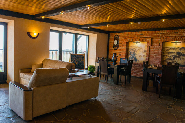 Южный зал рассчитан на 35-40 чел. Стилизован под сельскую таверну, имеет панорамные окна с чудесным видом на Волгу и остров Пустынный с высокого живописного склона.