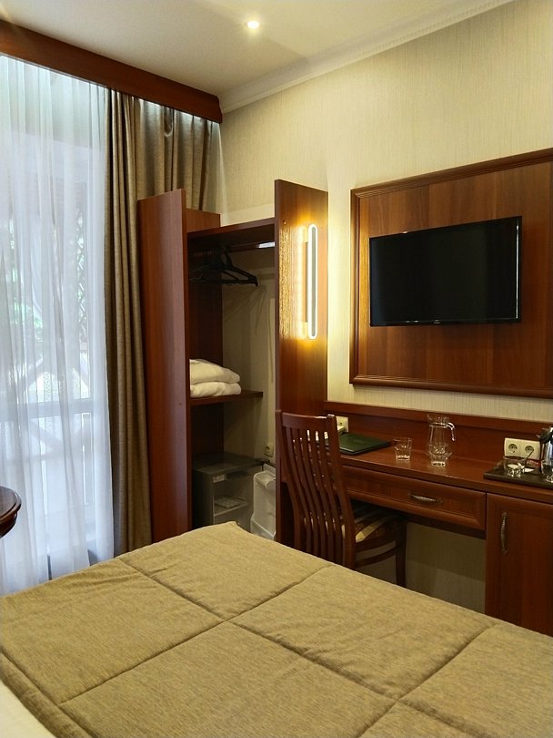 В санузле все гигиенические принадлежности. Чай, чайник. Свежая вода в кулере , рядом в коридоре. Персонал вежливый, оперативный. И что очень приятно удивило, цены в новогодние праздники снизили. Наш номер стол всего 2700! Окна выходят на реку( канал). Во дворе беседки и видно, что летом все зеленое и красивое. Парковка присутствует. Оставил самые лучшие впечатления! В следующий раз только сюда!впечатления! -