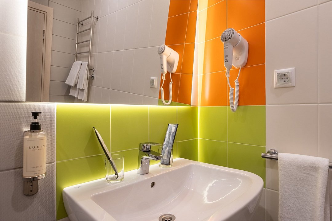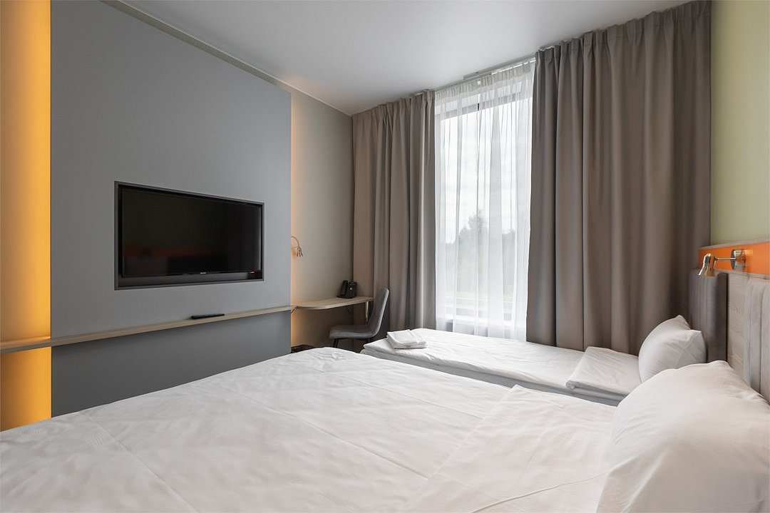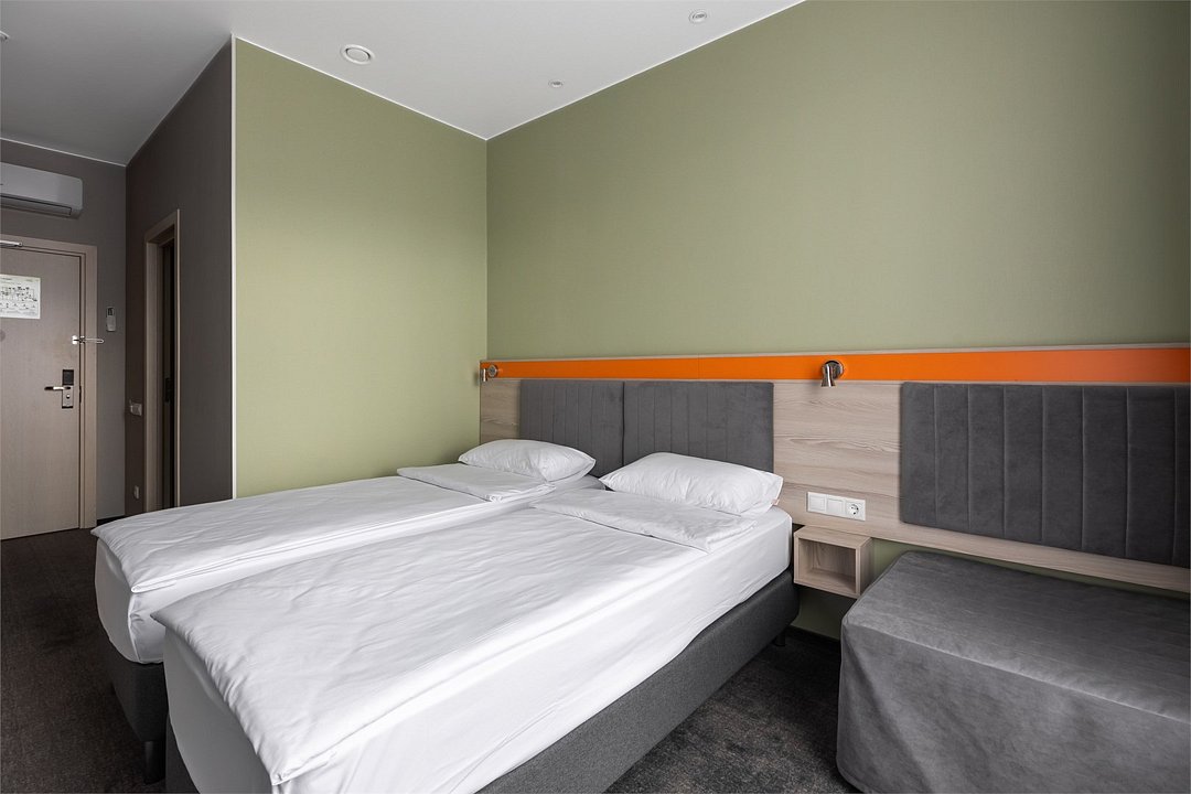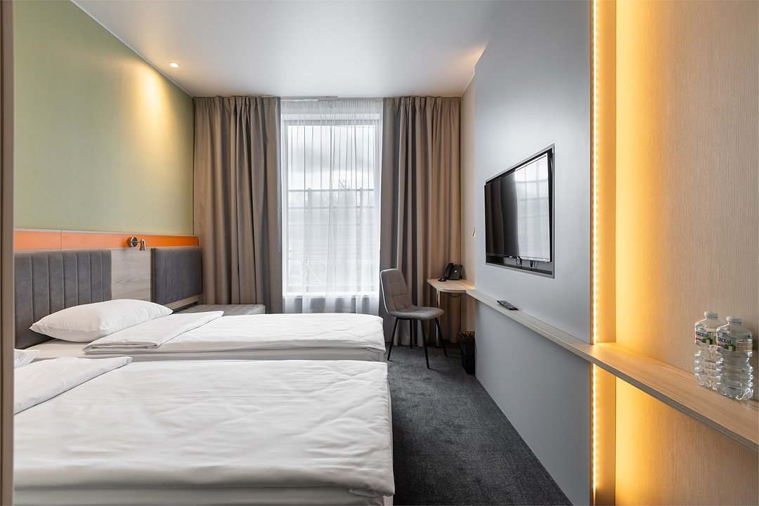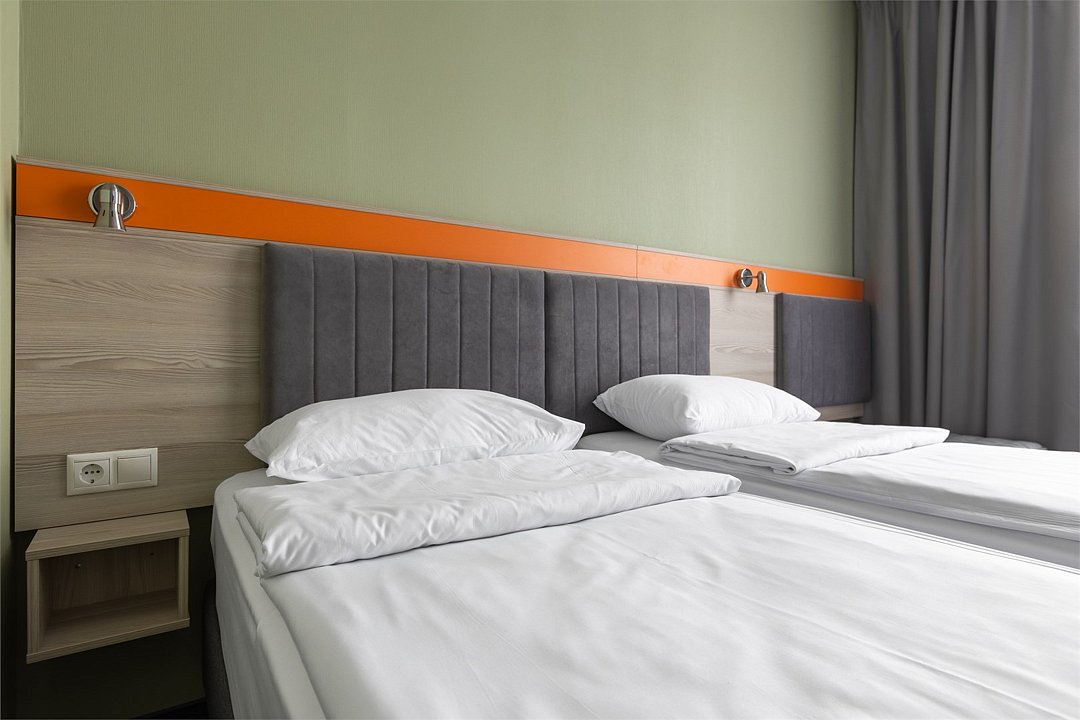 Номер площадью 18 м2 с 2 односпальными кроватями с анатомическим матрасом рассчитан на 2 взрослых и 1 ребенка. Для детей до 5 лет включительно проживание в одном номере со взрослыми предоставляется бесплатно на отдельном спальном месте. По запросу может быть предоставлена детская кроватка (для детей от 0 до 3 лет). В номере: Кровати с ортопедическими матрасами, телевизор, мини-бар, кондиционер, телефон. В собственной ванной комнате есть все необходимое для путешественников: набор полотенец, туалетно-косметические принадлежности, фен, тапочки. Для комфортного отдыха в номерах используются светонепроницаемые шторы и улучшенная звукоизоляция. Доступ к высокоскоростному интернету и рабочий уголок позволяют оперативно и комфортно решать рабочие вопросы. Размещение с домашними животными возможно за дополнительную плату только по предварительному согласованию с отелем. Собаки весом до 5 кг, кошки. Не более 1 питомца в номере. Стоимость размещения домашних животных - 1000 руб в сутки, депозит - 5000 руб.Услуги и удобства