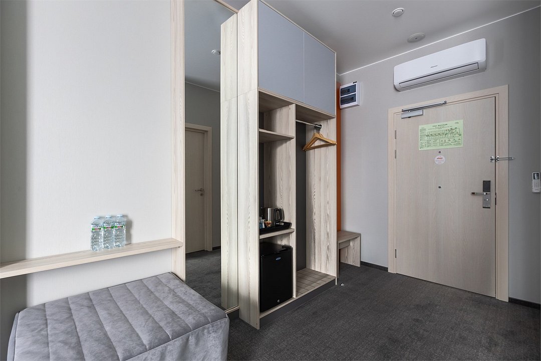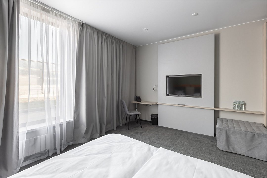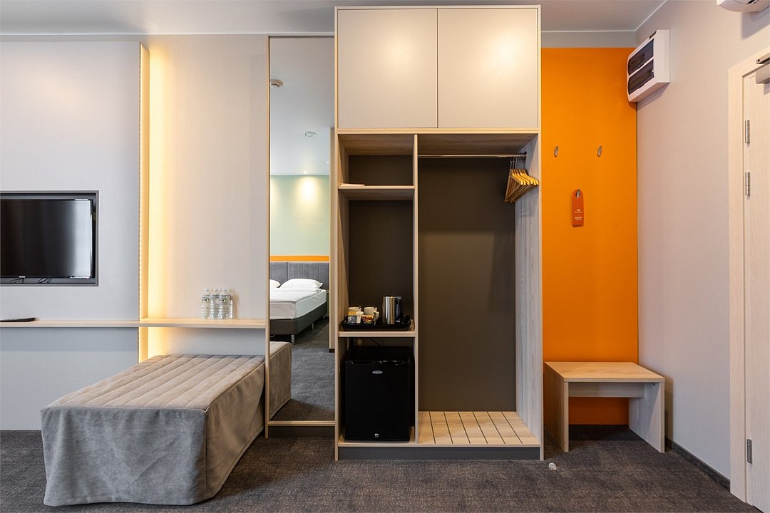 Номер площадью 18 м2 с 1 двуспальной кроватью с анатомическим матрасом рассчитан на 2 взрослых и 1 ребенка. Для детей до 5 лет включительно проживание в одном номере со взрослыми предоставляется бесплатно на отдельном спальном месте. По запросу может быть предоставлена детская кроватка (для детей от 0 до 3 лет). В номере: Кровать с ортопедическим матрасом, телевизор, мини-бар, кондиционер, телефон. В собственной ванной комнате есть все необходимое для путешественников: набор полотенец, туалетно-косметические принадлежности, фен, тапочки. Для комфортного отдыха в номерах используются светонепроницаемые шторы и улучшенная звукоизоляция. Доступ к высокоскоростному интернету и рабочий уголок позволяют оперативно и комфортно решать рабочие вопросы. Размещение с домашними животными возможно за дополнительную плату только по предварительному согласованию с отелем. Собаки весом до 5 кг, кошки. Не более 1 питомца в номере. Стоимость размещения домашних животных - 1000 руб в сутки, депозит - 5000 руб.Услуги и удобства