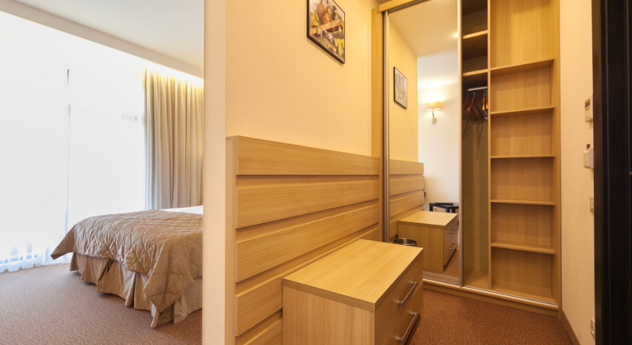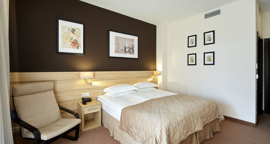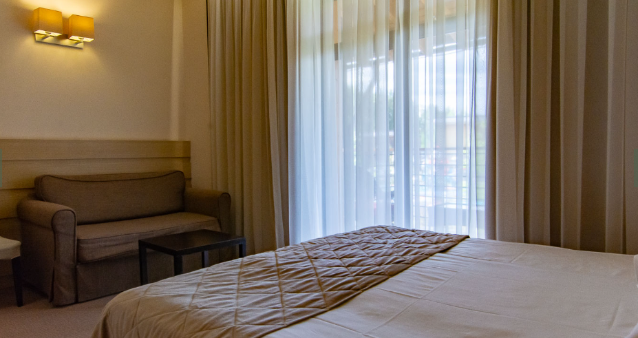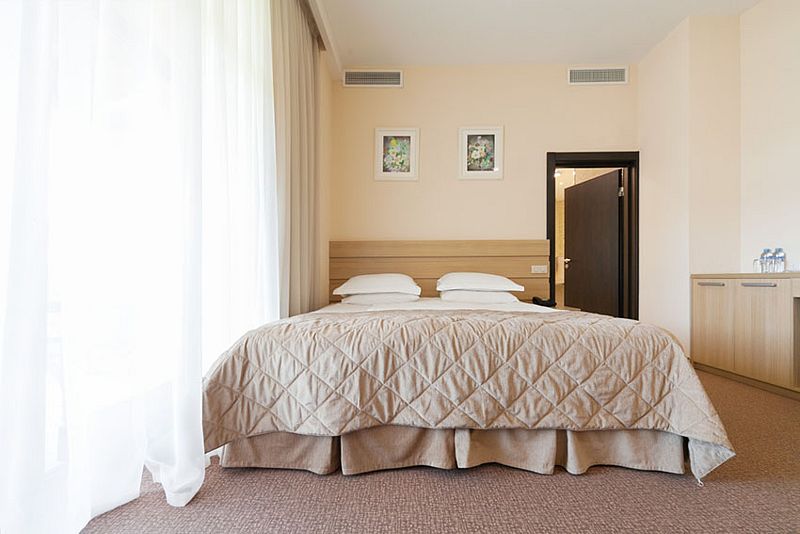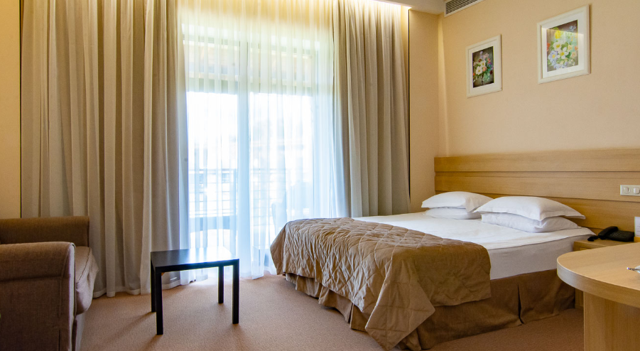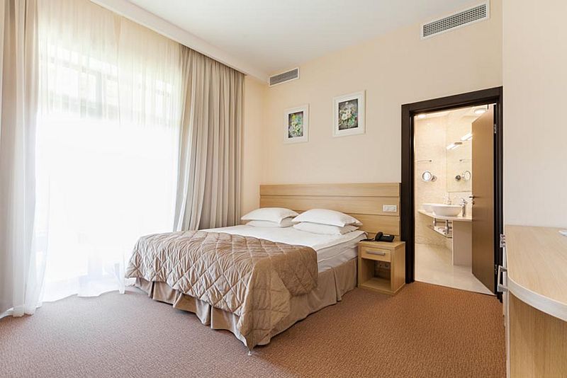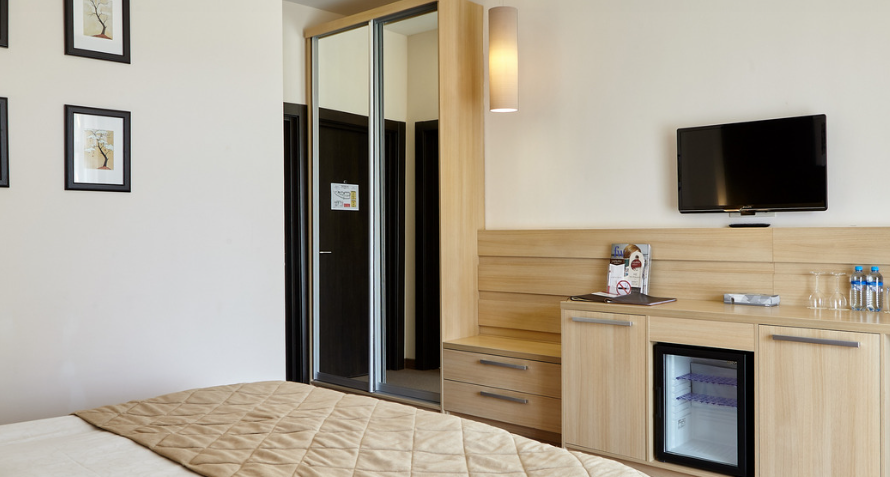 Кровать (180х20см) с ортопедическим матрасом, прикроватные тумбочки, рабочий стол, стул или пуф, зеркало в полный рост, встроенный гардероб, сейф, кондиционер, бесплатный wi-fi, телефон, спутниковые каналы, интерактивное телевидение, жк телевизор, мини-бар, услуга «звонок-будильник». Ванная комната: душевая кабина, фен, туалетные принадлежности, халат и тапочки. Большинство номеров имеют собственную террасу или балкон.