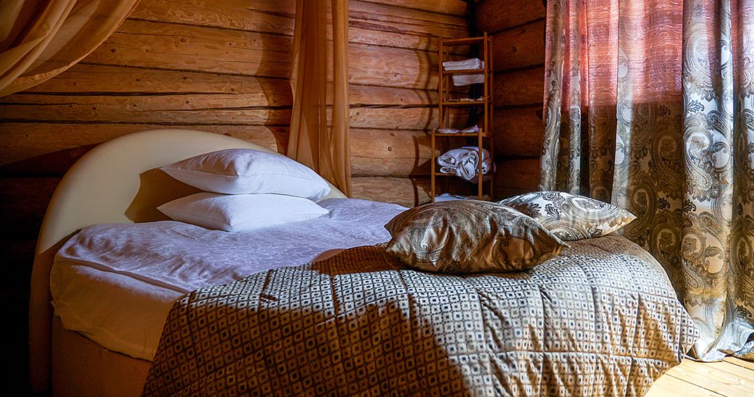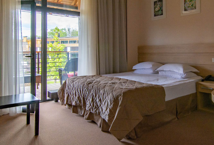 Кровать (180х200см) с ортопедическим матрасом, диван, прикроватные тумбочки, рабочий стол, стул или пуф, зеркало в полный рост, встроенный гардероб, сейф, кондиционер, бесплатный wi-fi, телефон, спутниковые каналы, интерактивное телевидение, жк телевизор, мини-бар, услуга «звонок-будильник». Ванная комната: душевая кабина, фен, туалетные принадлежности, халат и тапочки. Номера расположены в отдельных коттеджах.