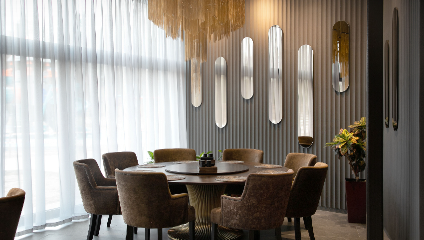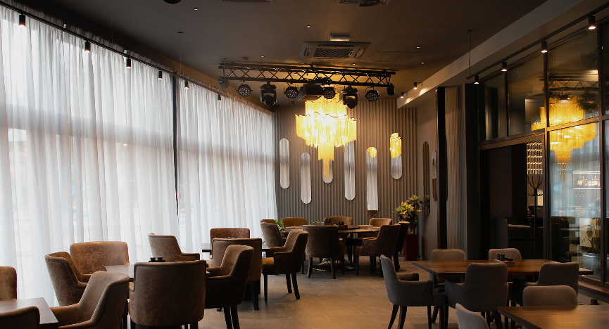 Стильный зал площадью 120 м², с двумя балконами, расположен на втором этаже ресторанного комплекса.