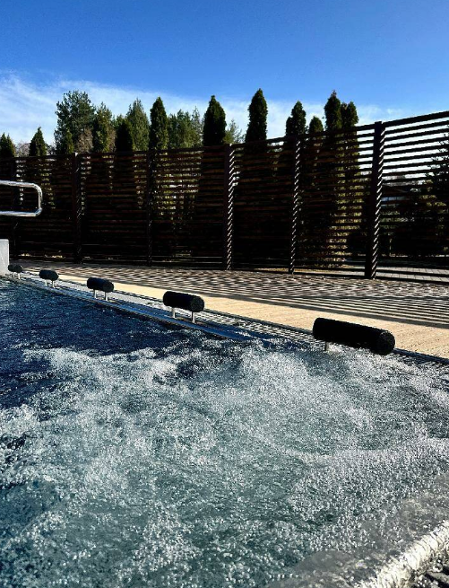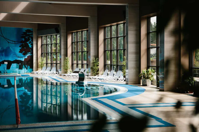 Бассейн с панорамными окнами и красивым видом на лесопарковую территорию. Здесь проводятся профессиональные тренировки, сеансы оздоровительного плавания, индивидуальные занятия для детей по обучению плаванию.
