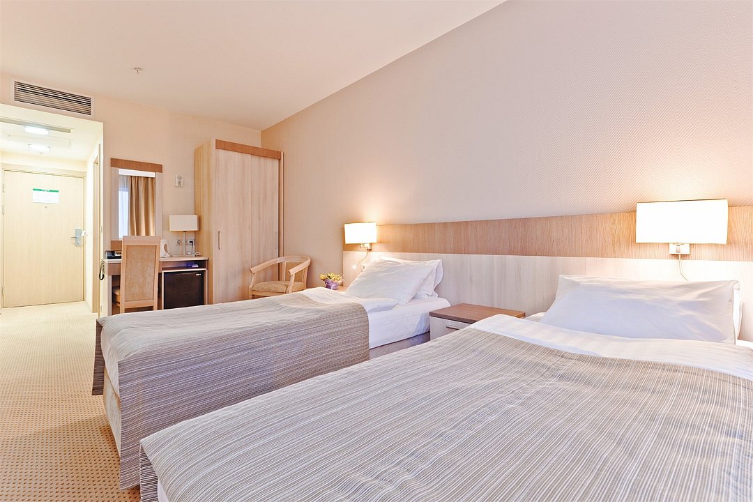 телевизор, Wi-Fi, телефон, холодильник, кондиционер, фен, душевая кабина, банные полотенца, косметические средства, две односпальные кровати, шкаф для одежды, письменный стол, мини-бар, письменные принадлежности, чайный набор, набор посуды, обслуживание номеров, сейф, чайник, питьевая вода, ковровое покрытие, вид на город, цифровое тв, можно с питомцамиВ гостиничном номере