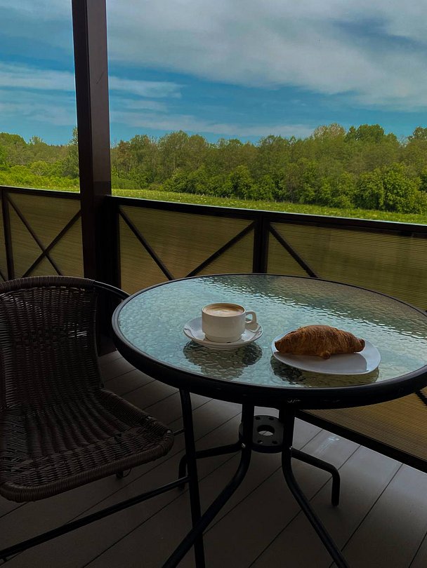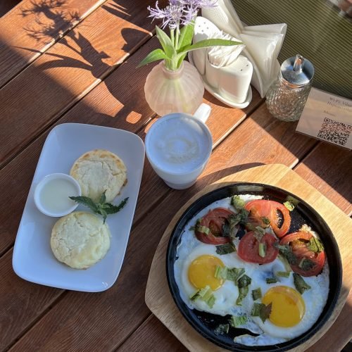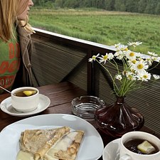 Почти все блюда приготовлены из продуктов выращенных на нашей ферме. Омлет из домашних яиц, запечённые сырники из натурального творога, вкусный чай из ягод с наших полей.