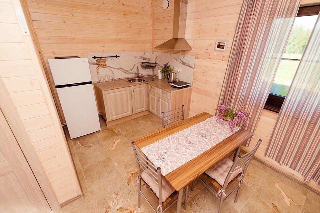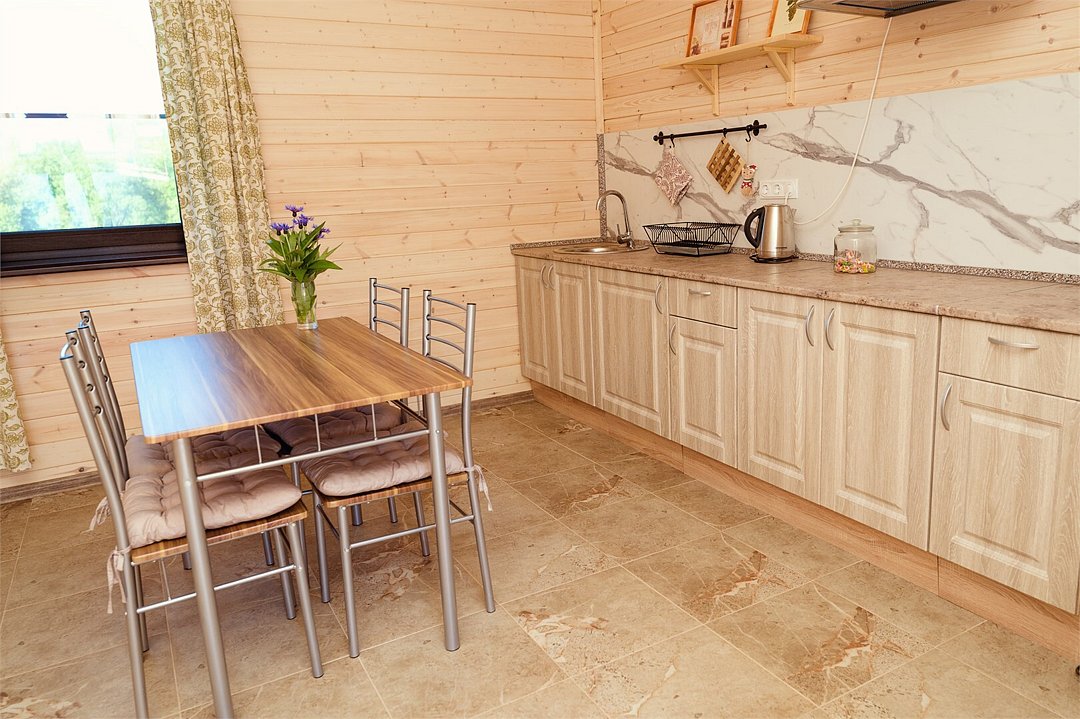 Кухня в номере и отдельный вход с улицы. Светлый и просторный номер делится на зону кухни и зону спальной комнаты. На кухне есть все необходимое для приготовления блюд.