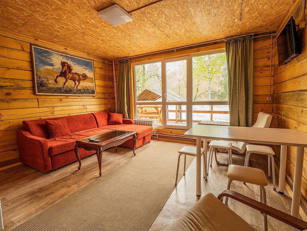 Панорамный вид с выходом на террасу и шум речки Баранголки подарит расслабление и ощущение единения с природой.Услуги и удобства