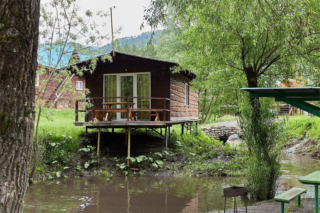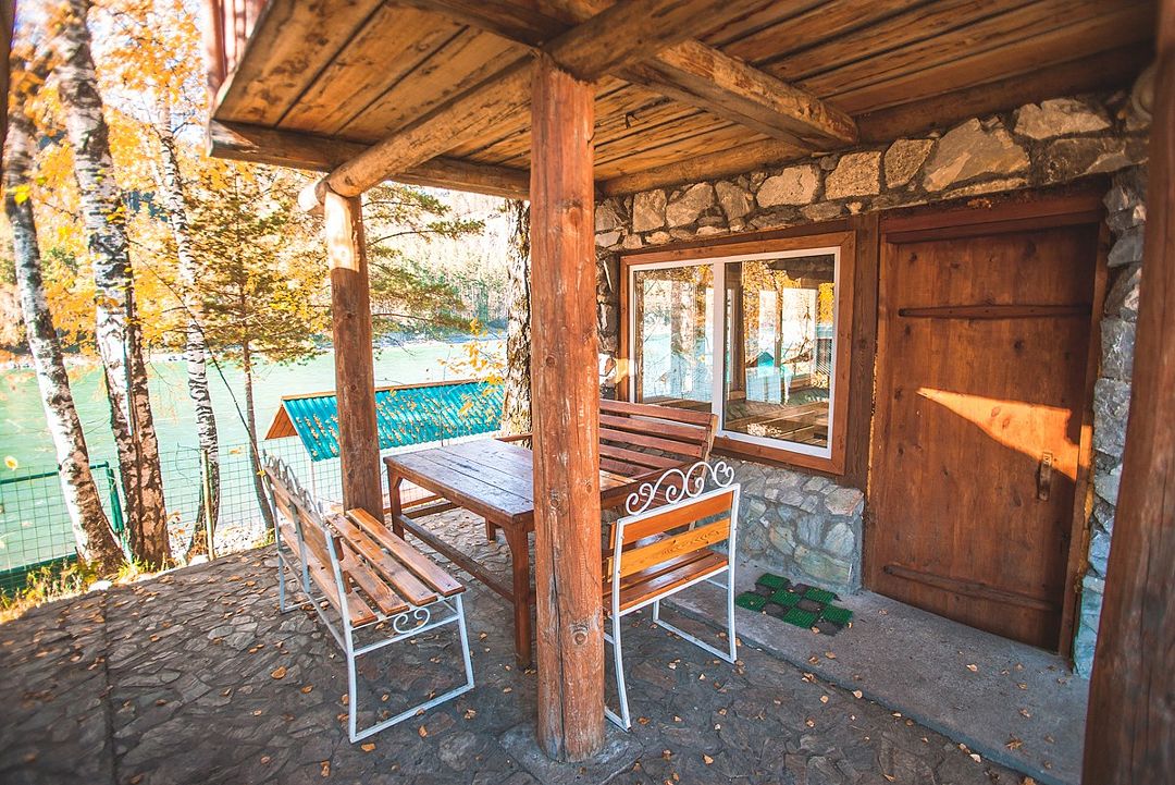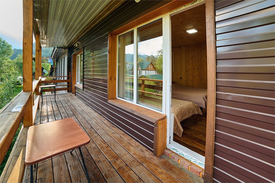 Номер внутри двора базы, с общей террасой и видом на речку Баранголку, которая протекает по территории базы и впадает в р. Катунь.Услуги и удобства