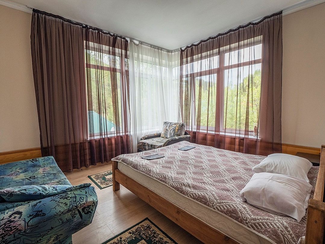 телевизор, спутниковое телевидение, водонагреватель, балкон с красивым видом, терраса, двуспальная кровать, односпальная кровать, стулья, вешалки, обеденный стол, зеркало, ковер, набор посуды, чайник, раковина, обеденная зона, отопление, отдельный вход в номер, душ, три комнаты, вид во двор, стаканы, столовые приборы, кофейный столик, тумба, туалетные средства, туалет, мангал, мини-холодильник, вид на горы, номер для некурящих, вид на лес, межкомнатная дверь, уборка номера, мыло, вид на ручей, можно с питомцамиВ гостиничном номере