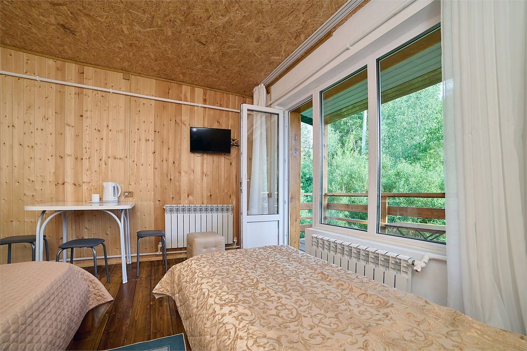 Комфортный номер, в котором есть отдельный вход с окном открывающим вид на территорию базы отдыха.Услуги и удобства
