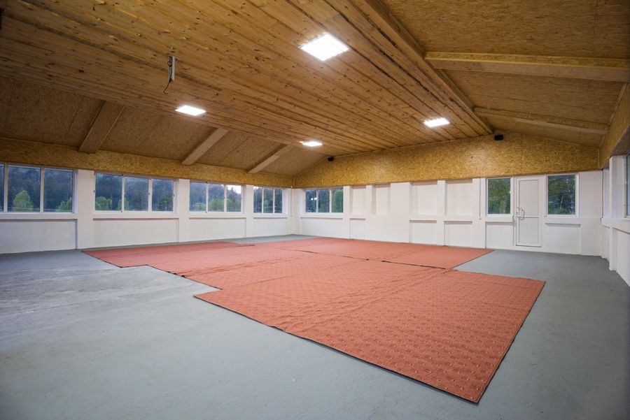 Большой зал в 125 квадратных метров с панорамными окнами, внутри которого есть все необходимое для проведения коллективных занятий йогой, просмотра фильмов, показа презентаций.