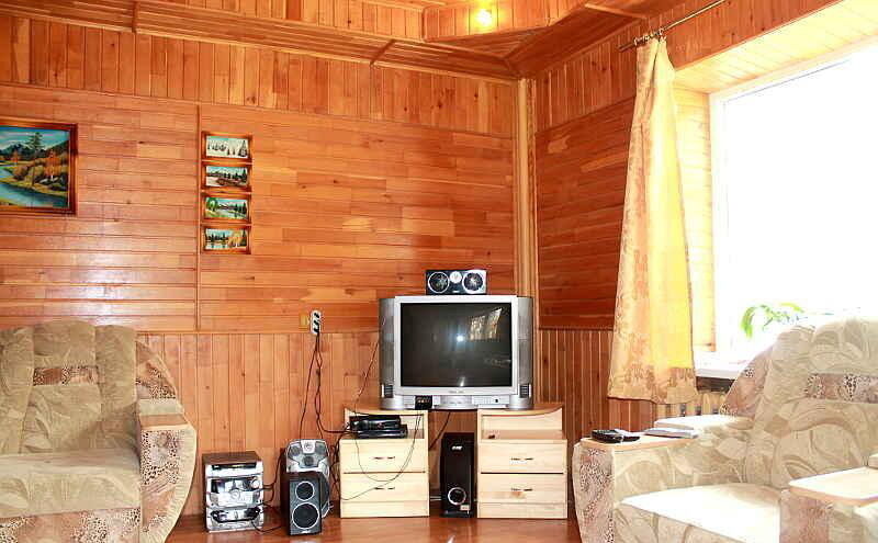 - Кирпичный снаружи, с отделкой деревом внутри. Рассчитан на компанию 10 человек + 5 дополнительных мест.