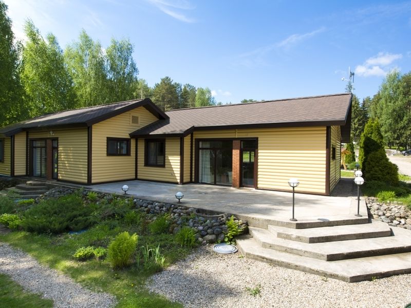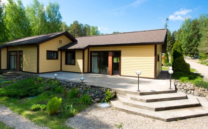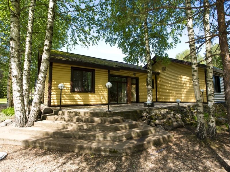 Одноэтажной шале с двумя спальнями, гостиной с кухонной зоной; есть беседка. оборудованная мангалом и мебелью.