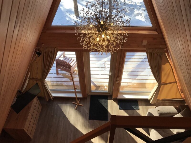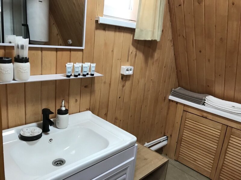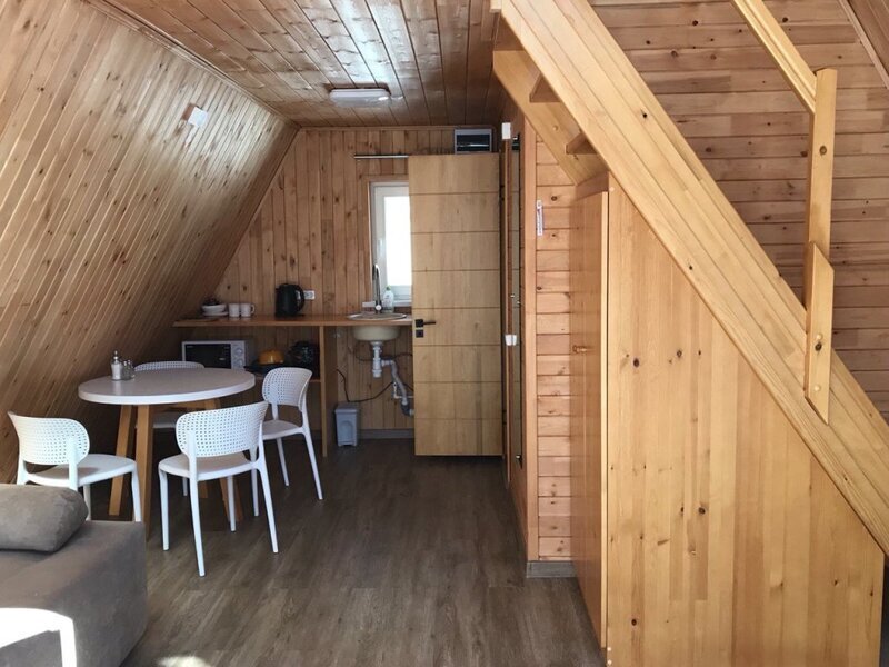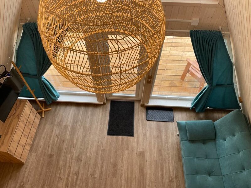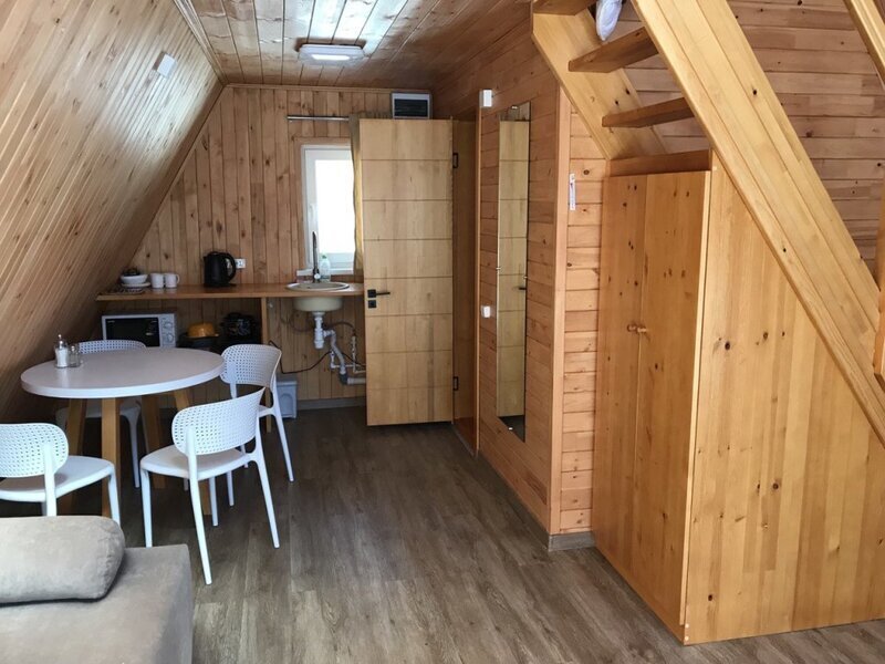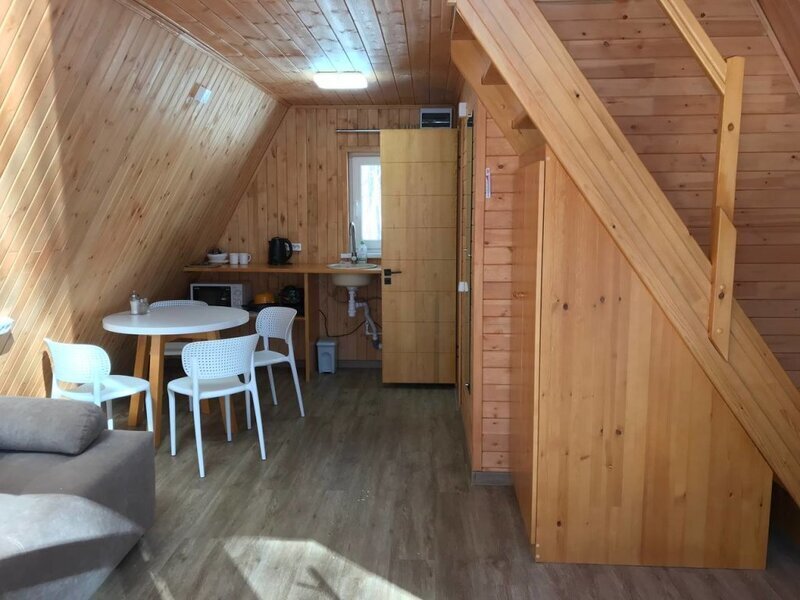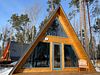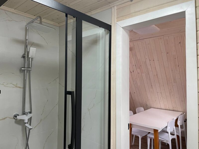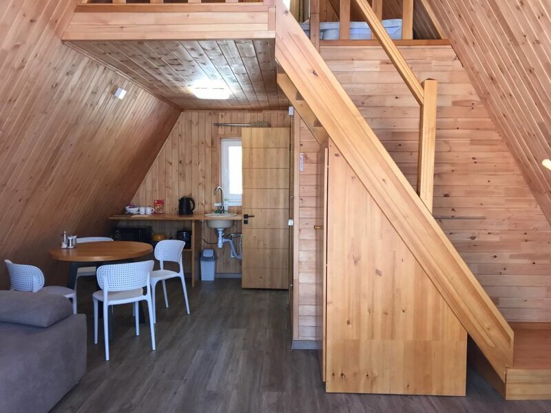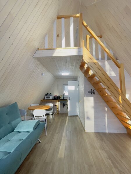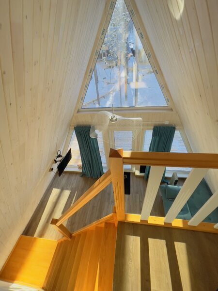 Уютный двухуровневый эко-домик в стиле А-фрейм с панорамными окнами в бирюзовом цвете, с теплыми полами и индивидуальной террасой. Выполнен из натурального дерева по современным технологиям. На первом этаже расположены гостиная и ванная комната, на втором этаже - спальня. В ванной - косметические и гигиенические принадлежности. В гостиной зоне - удобный раскладной диван, ТВ. В спальне на втором этаже - две раздельные кровати с возможностью соединить в одну большую семейную кровать. На открытой террасе деревянные кресла.