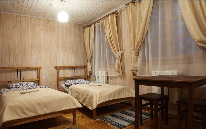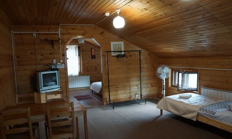 Всего уютных домиков на территории базы – три. Уютный домик представляет собой небольшой, отдельностоящий деревянный коттедж оснащенный всеми необходимыми атрибутами для комфортного проживания. Первый уютный домик имеет две полутора спальные кровати и рассчитан на проживание до 2 человек, остальные уютные домики имеют по три полутора спальные кровати и соответственно рассчитаны на проживание до 3 человек. Во всех уютных домиках есть сан.узел (раковина и туалет), обеденный столик, спутниковое ТВ. Единственный минус – отсутствие душевой. Гости, проживающее в коттеджах Уютных могут принимать горячий душ в нашей бане неограниченное кол-во раз.