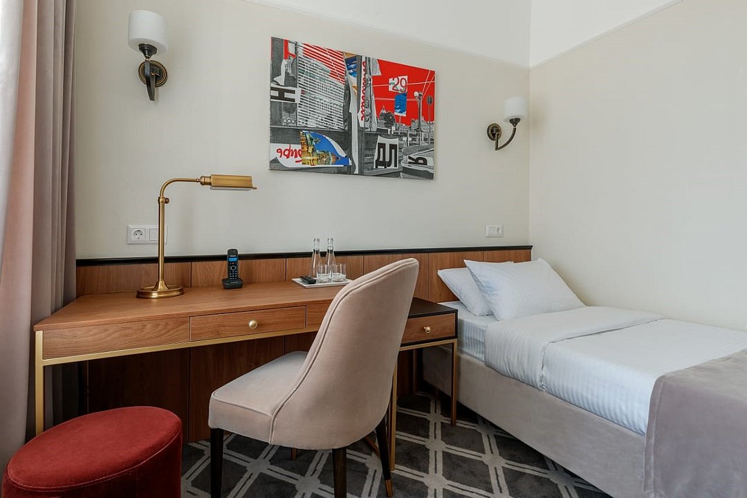 Номер с кроватью "Single". Комфорт дополняет современная дизайнерская мебель. В числе удобств — система климат-контроля, телевизор с плоским экраном, холодильник, сейф. Собственная ванная комната, которая укомплектована феном и бесплатными туалетно-косметическими принадлежностями.Услуги и удобства