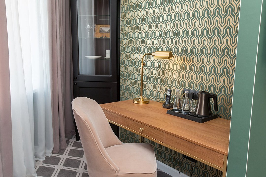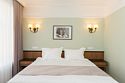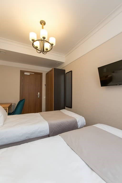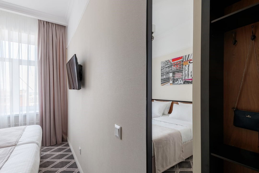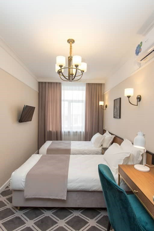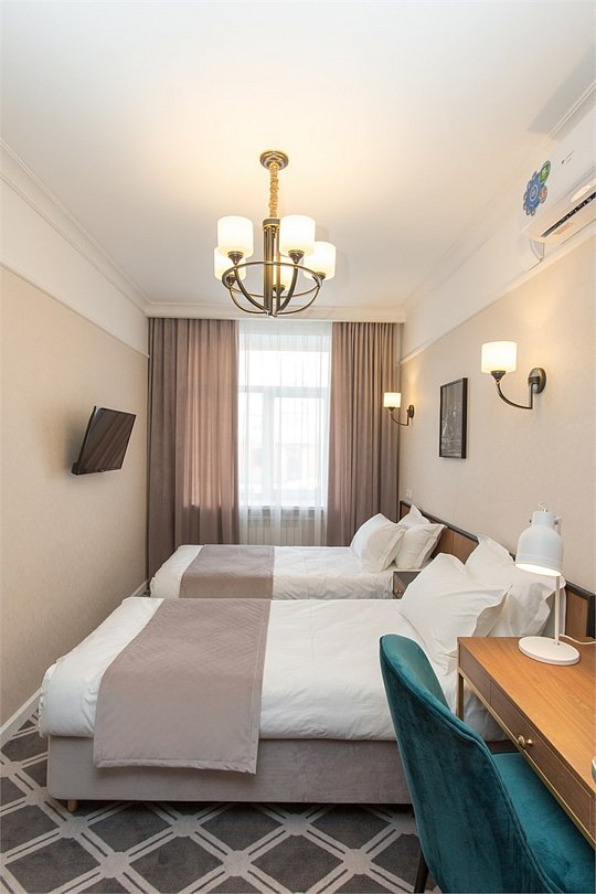 телевизор, кабельное телевидение, Wi-Fi, интернет, кондиционер, светильник, фен, электронные замки, санузел, халаты, тапочки, косметические средства, две односпальные кровати, кресла, тумбы, гардеробная, письменный стол, зеркало, пуфики, эксклюзивная мебель, мини-бар, набор посуды, сейф, чайник, унитаз, раковина, душ, вид на город, кресло, вид во двор, стаканы, стул, стол, туалетные средства, внутренний телефон, мини-холодильник, гостиничная парфюмерияВ гостиничном номере