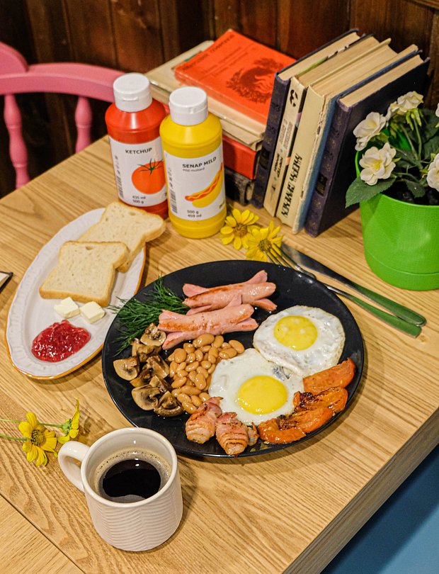 Завтрак «Английский» порадует гурманов: глазунья из двух яиц подается с жареными сосисками, шампиньонами, томатом и беконом. Дополняют блюдо два тоста с джемом и маслом, а для завершения предлагается выбор между освежающим чаем и ароматным кофе.