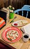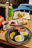 Завтрак «Французский» приятно удивляет омлетом с беконом и свежим помидором. К блюду добавляются два тоста с джемом и маслом, а в качестве напитка можно выбрать между чашкой ароматного чая и кофе.
