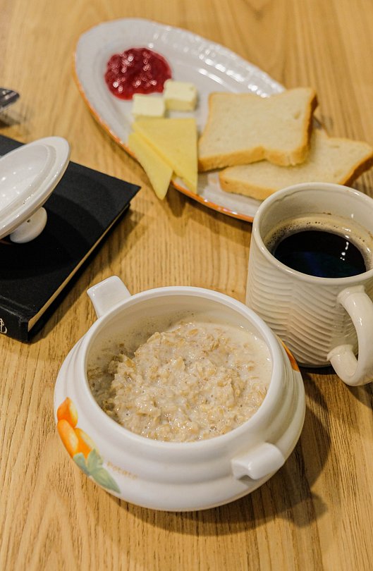 Завтрак «Русский» предлагает сытную тарелку геркулесовой каши с маслом. В дополнение к ней подаются два тоста с сыром, джемом и маслом. А в качестве напитка можно выбрать ароматный чай или крепкий кофе.