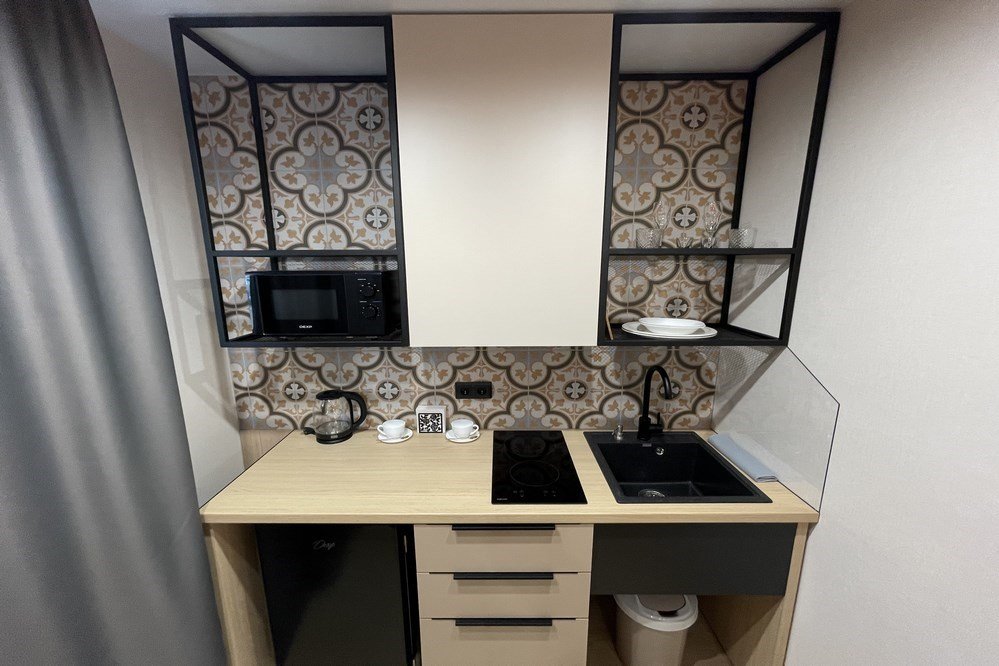 Двухместный дизайнерский, современный номер с кухонной зоной и кондиционером. Идеально подходит для комфортного размещения, в том числе для длительного проживания.Услуги и удобства