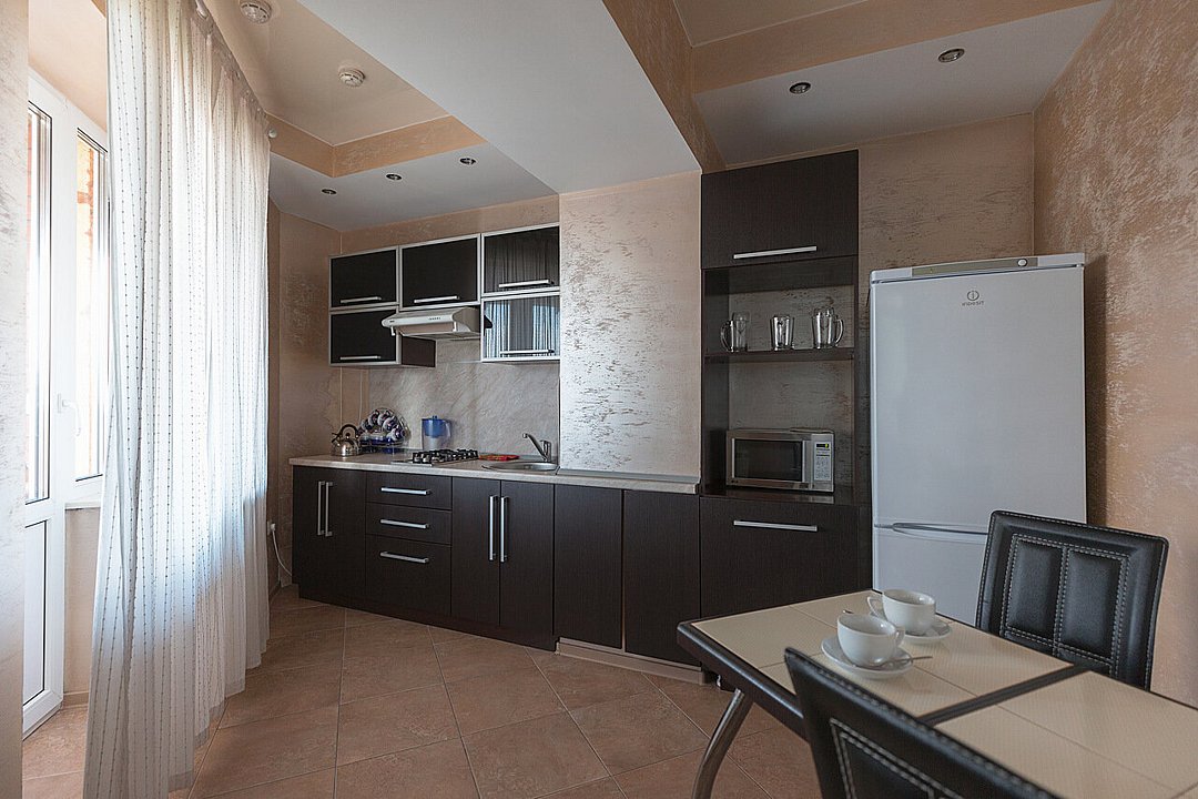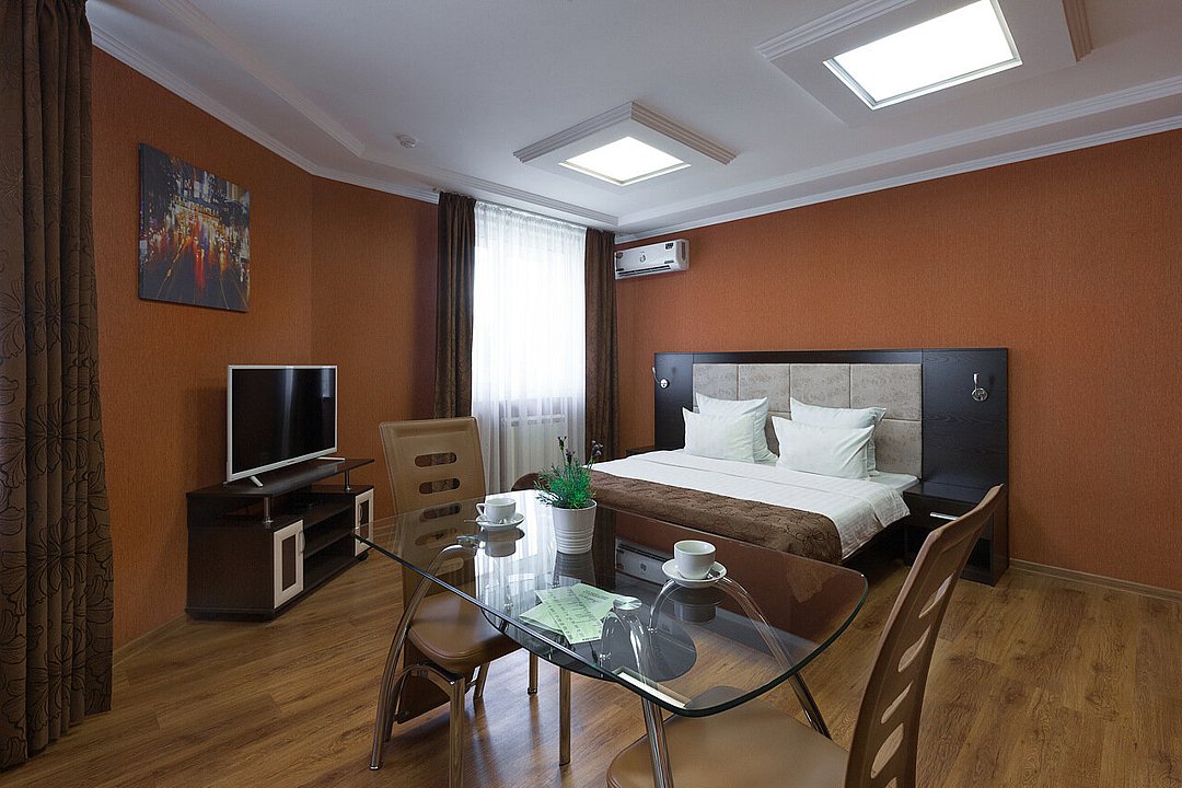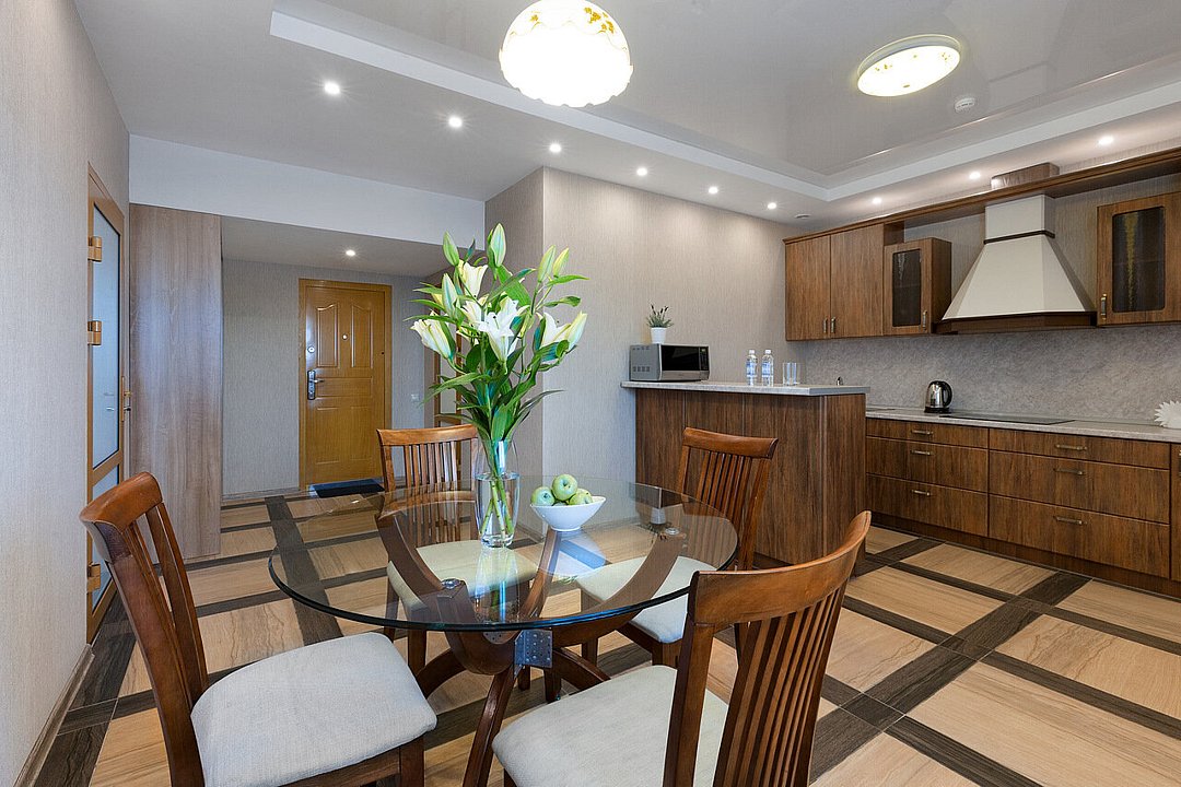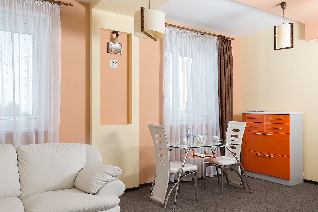 Здесь вы сможете с комфортом разместиться в одном из нескольких номеров, каждый из которых оборудован кухней и всеми удобствами, необходимыми для временного проживания.