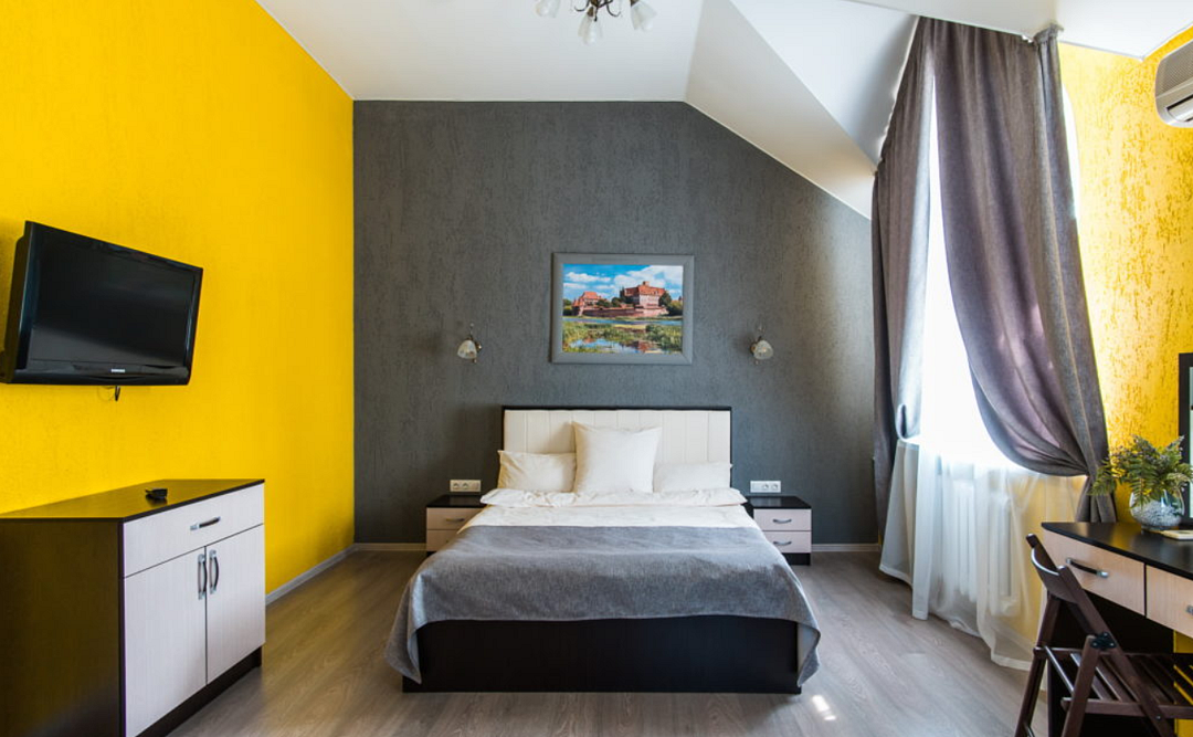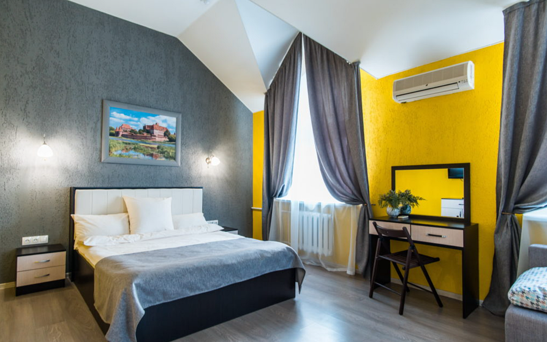 Двухместный номер с большой 2-спальной кроватью площадью в 20 м2. Номер, который выполнен в классическом стиле, с высокими потолками, рабочим столом и всеми необходимыми принадлежностями.