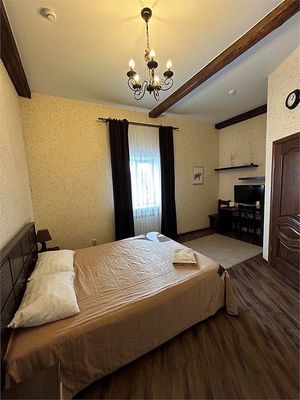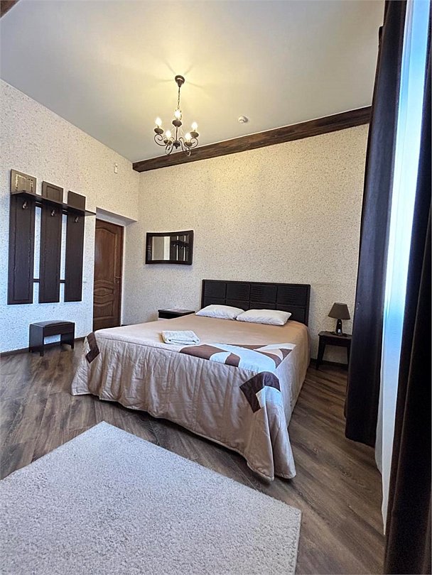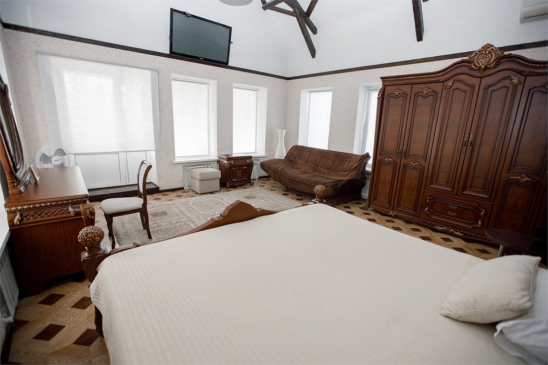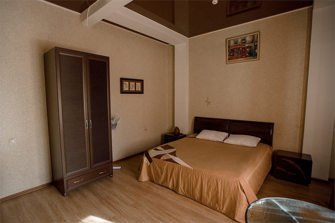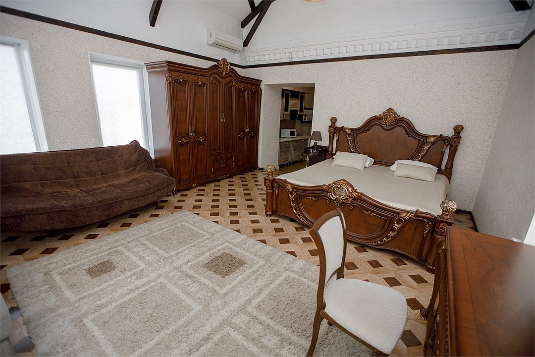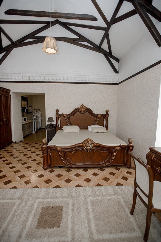Роскошный просторный номер с кондиционером, балконом и кухонной зоной. В номере двуспальная кровать и мебель под старину. Номер идеально подходит для молодожёнов и романтических уик-эндов. Выход через балкон на просторную персональную террасу. В мини-отеле есть общая кухня, баня, беседка BBQ, прачечная.Услуги и удобства