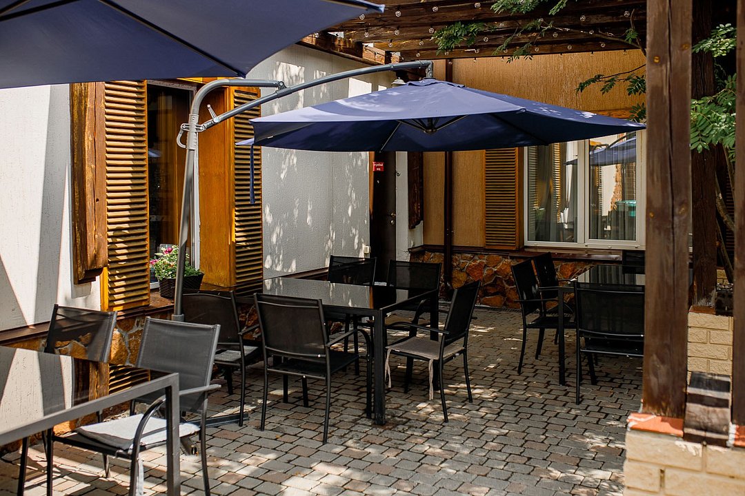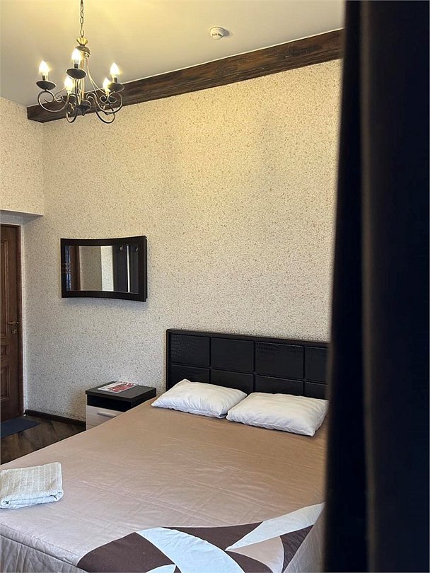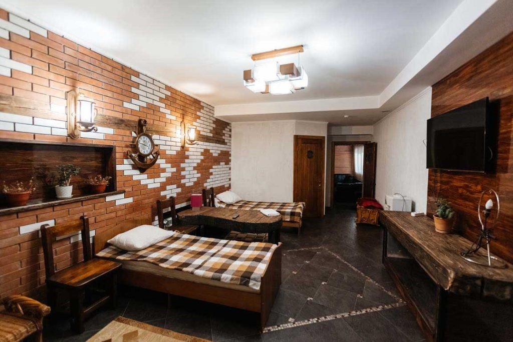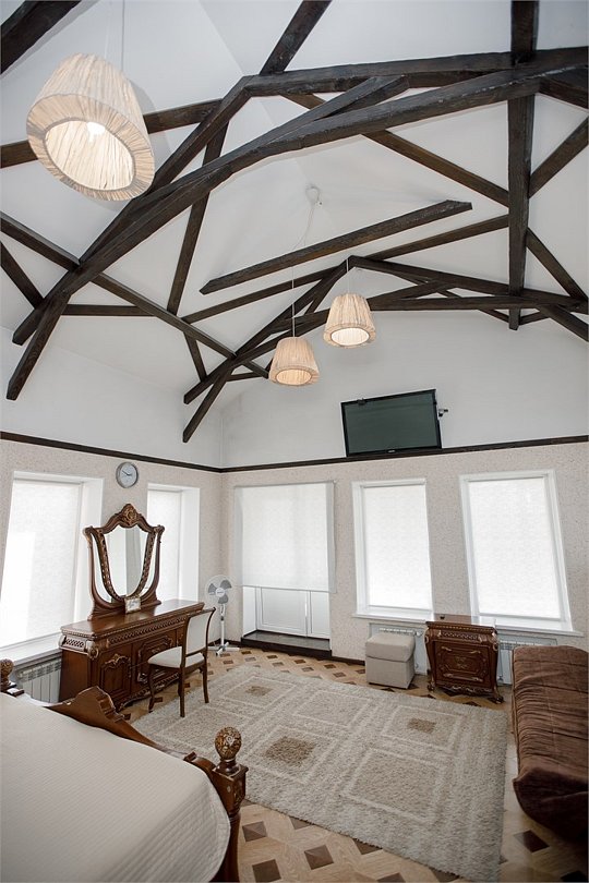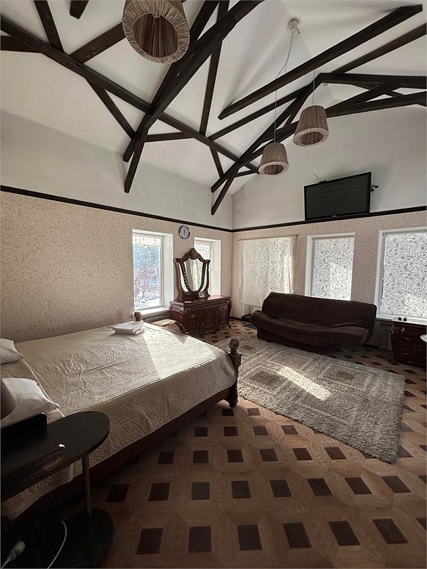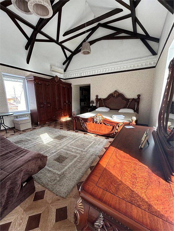 Роскошный просторный номер с кондиционером, балконом и кухонной зоной. В номере двуспальная кровать и мебель под старину. Номер идеально подходит для молодожёнов и романтических уик-эндов. Выход через балкон на просторную персональную террасу. В мини-отеле есть общая кухня, баня, беседка BBQ, прачечная.Услуги и удобства