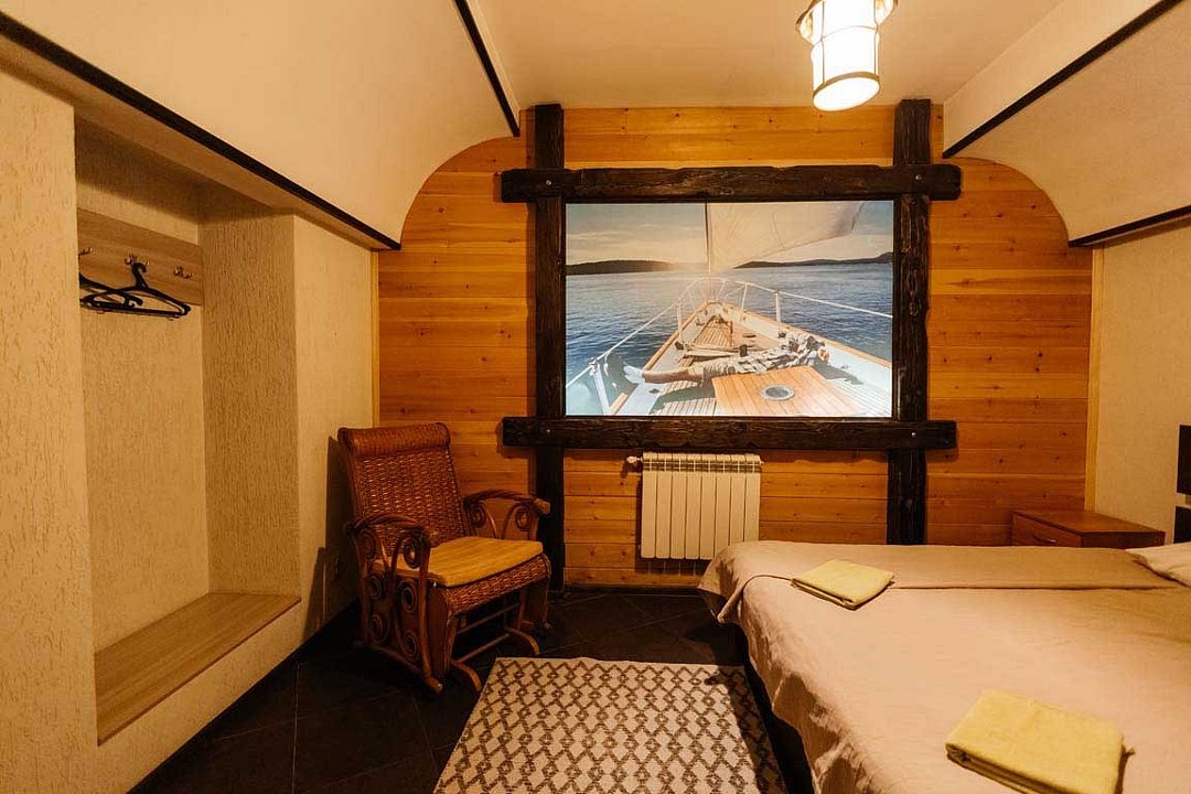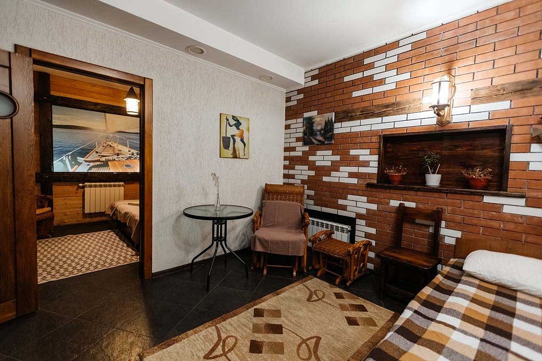 Двухкомнатный просторный номер с особенным расположением в здании, поэтому в номере нет окон. Подходит для многоместного размещения и семей с детьми. 2 смежных комнаты 12 и 25 кв. м. В комнате 25 кв. м. расположен вход в ванную комнату и вторую спальню, 3 односпальные кровати, телевизор. В комнате 12 кв. м. двуспальная кровать. В большой спальне возможно размещение дополнительного спального места - еврораскладушки. Номер расположен на 1 этаже, подходит для маломобильных групп граждан. В мини-отеле есть общая кухня, баня и беседка BBQ.Услуги и удобства
