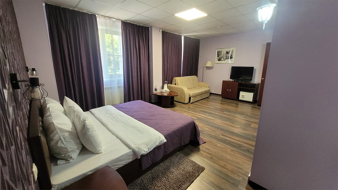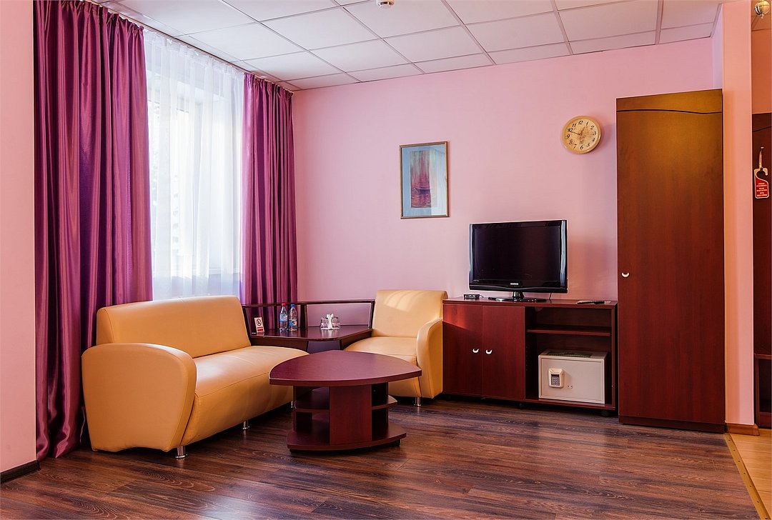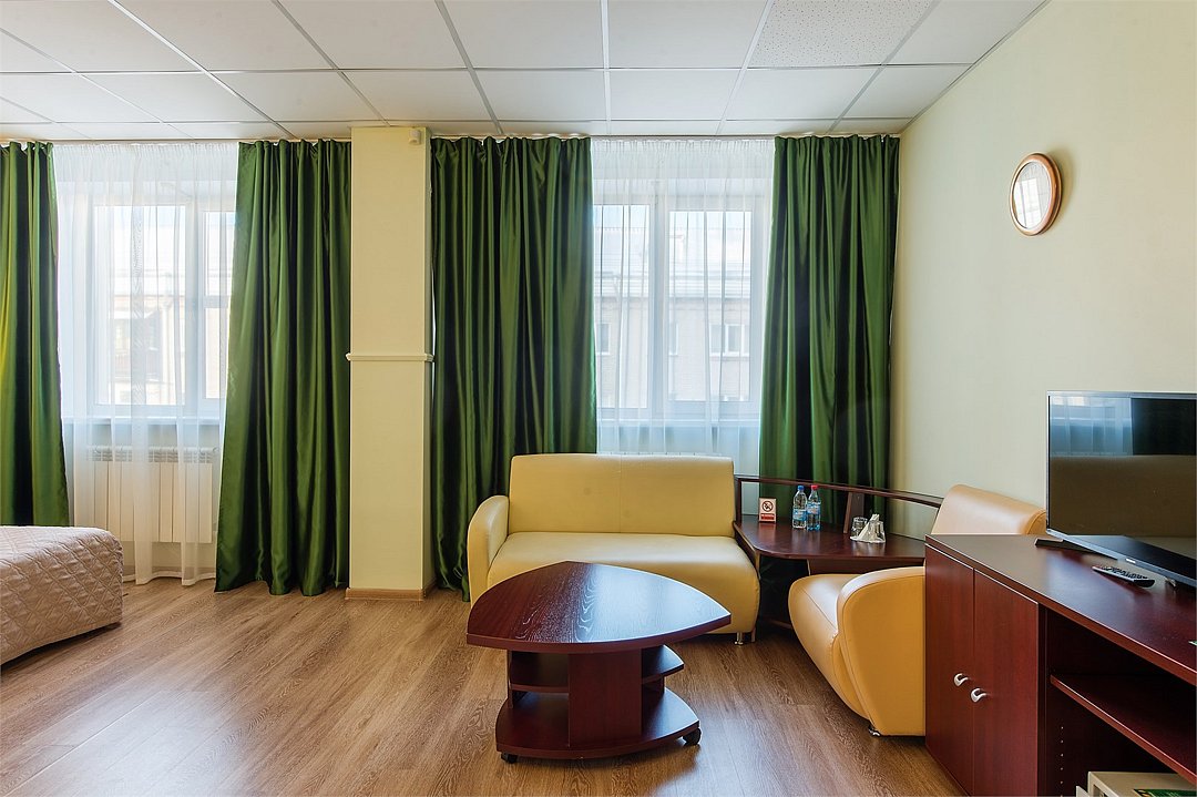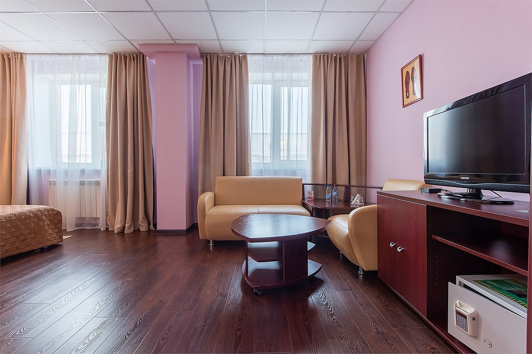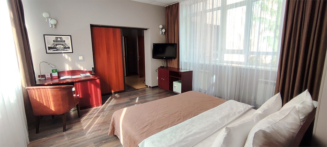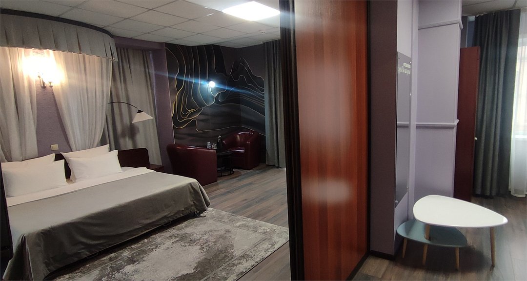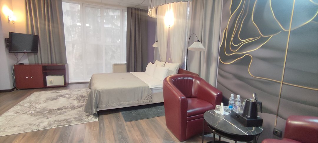 Номера высшей категории Junior Suite (Джуниор Сьют) отличаются оригинальным дизайном и повышенной комфортностью. Имеется мягкая зона для отдыха, большая ванная комната, сейф, тренажёр.Услуги и удобства