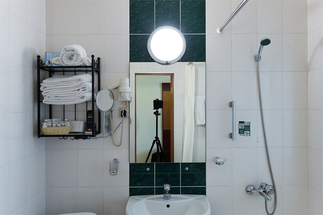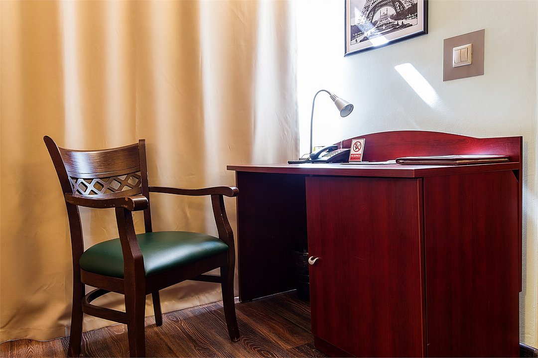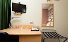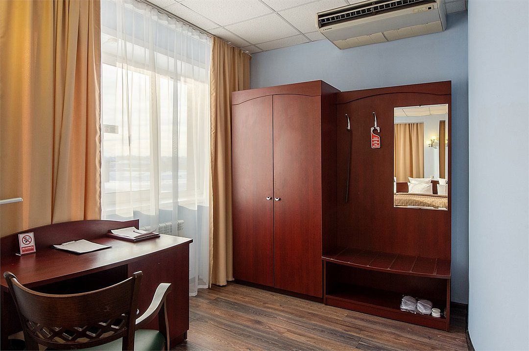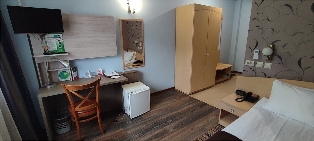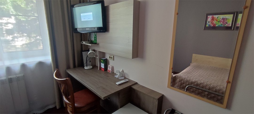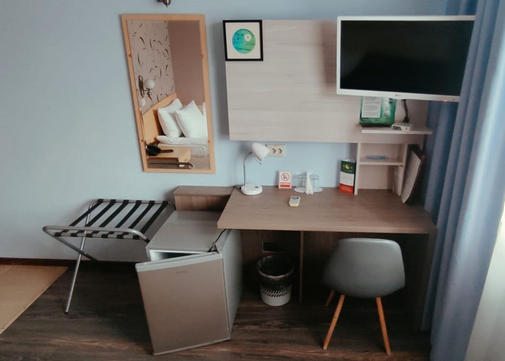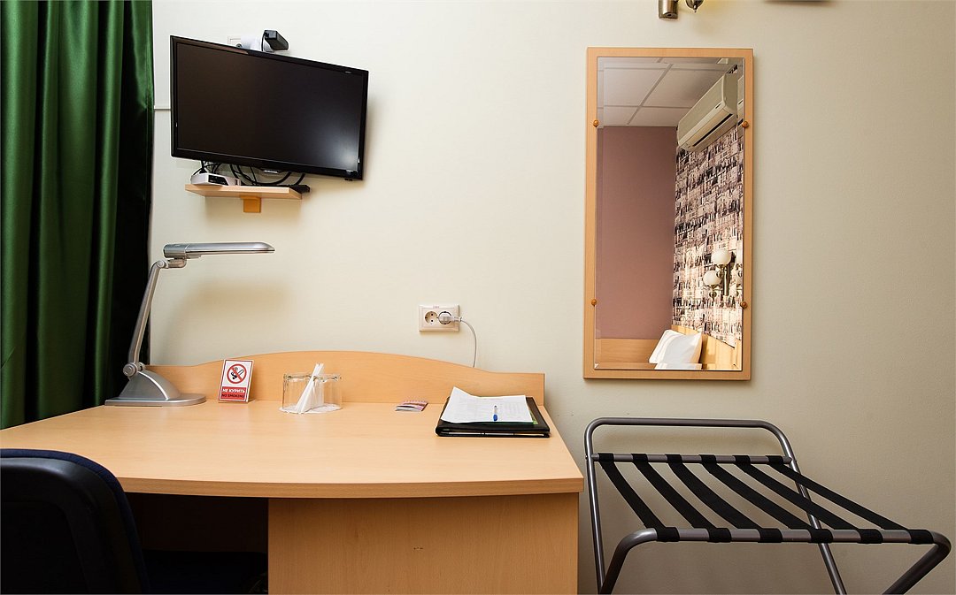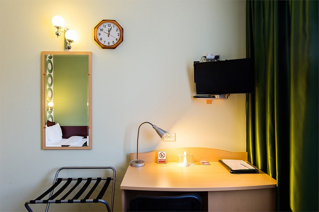 кабельное телевидение, Wi-Fi, телефон, кондиционер, светильник, настольные лампы, фен, электронные замки, душевая кабина, односпальная кровать, багажная тумба, зеркало, письменные принадлежности, обслуживание номеров, отопление, вид на город, кулер на этаже, вид во двор, ламинат, стаканы, стул, телевизор с плоским экраном, мини-холодильник, москитная сетка, номер для некурящих, рабочий стол, холодильный шкаф, уборка номера, услуги прачечной (платно), вешалки-плечики, затемняющая штора, часы-будильникВ гостиничном номере