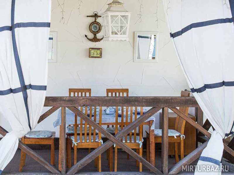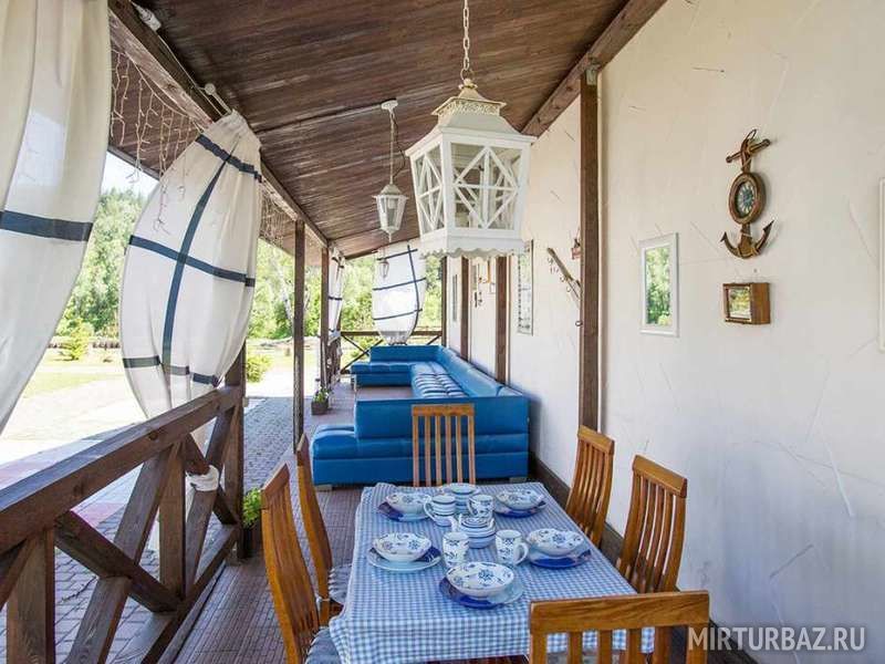Терраса для комфортного отдыха: удобный мягкий диван для большой компании, стол с сервировкой в морском стиле.