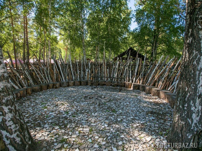 Уютное место у костра, где можно отдохнуть от цивилизации, поиграть на гитаре и посидеть на пеньках.