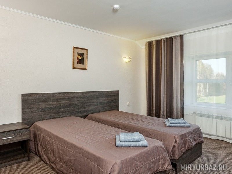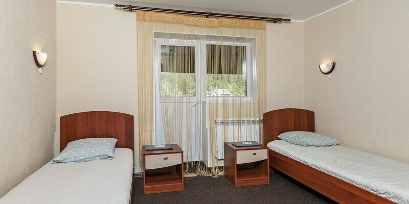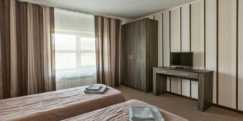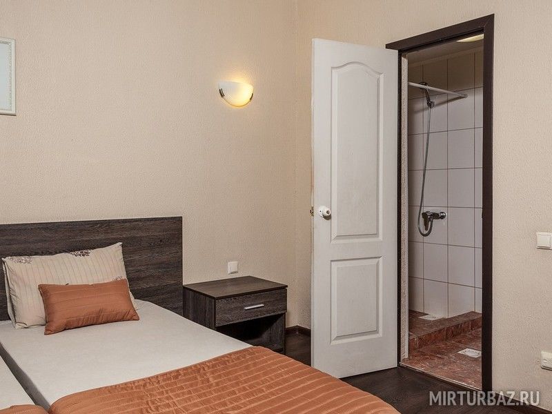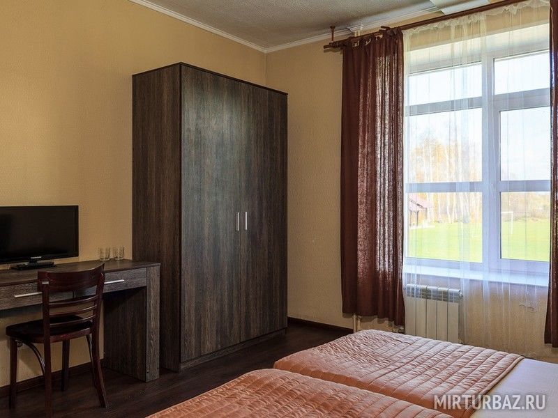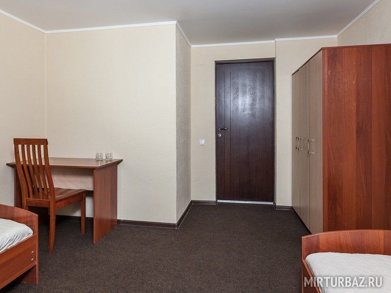 В номере: 2 односпальные кровати, прикроватные тумбочки, шкаф, письменный стол.