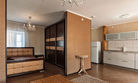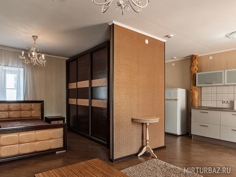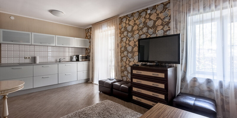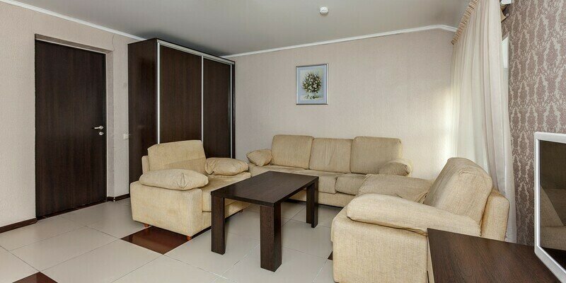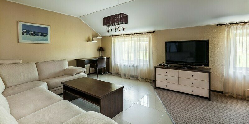 В номере: двуспальная кровать, диван, холодильник, плазменный телевизор, шкаф, журнальный столик, письменный стол.