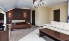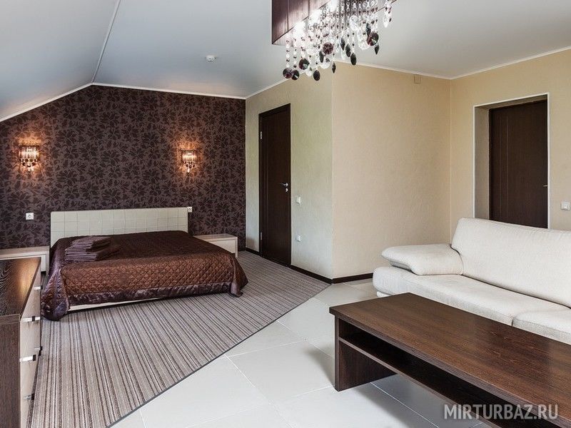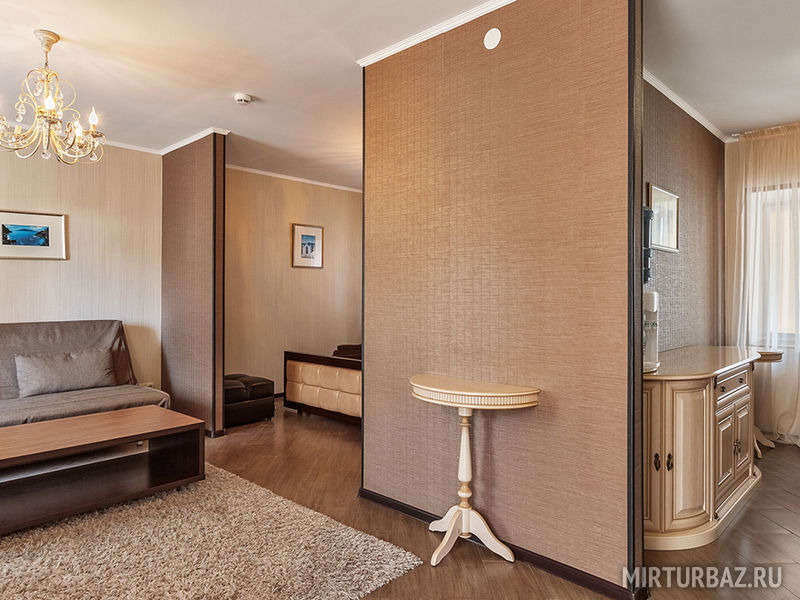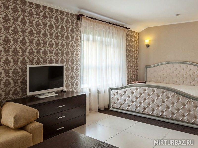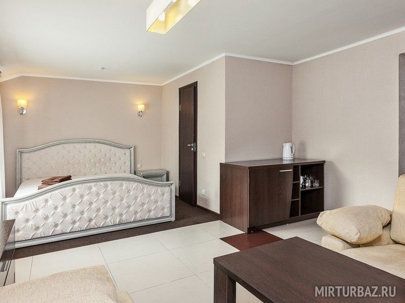 В номере: двуспальная кровать, диван, холодильник, плазменный телевизор, прикроватные тумбочки, журнальный столик, письменный стол, шкаф.